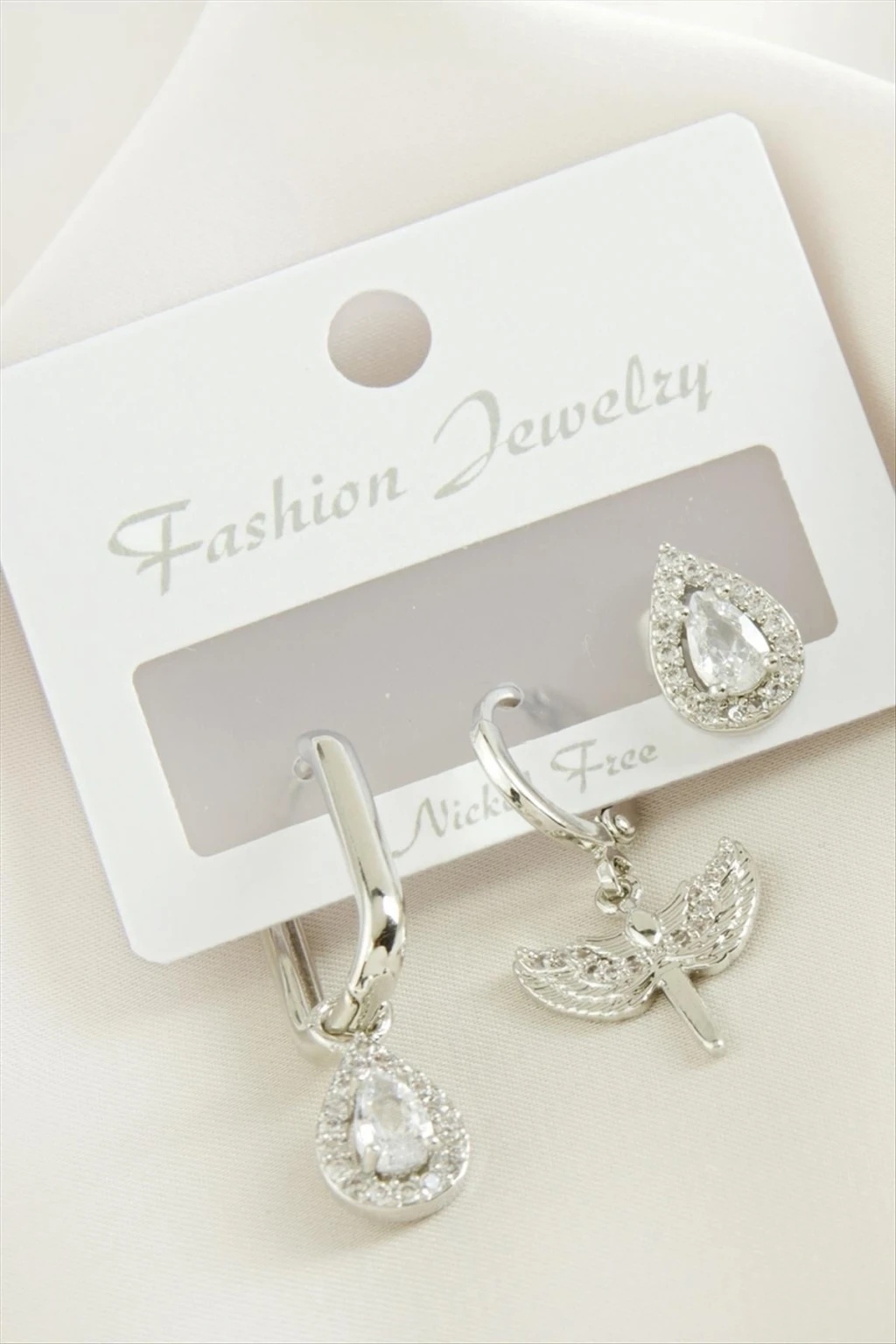 Küpe; Ürün malzemesi metal ve zirkon taşından imal edilmiştir. 1 sınıf kaliteli malzeme kullanılmıştır. Ürün boyu 3 cmdir. 1 kartta 3 adet küpe bulunmaktadır.