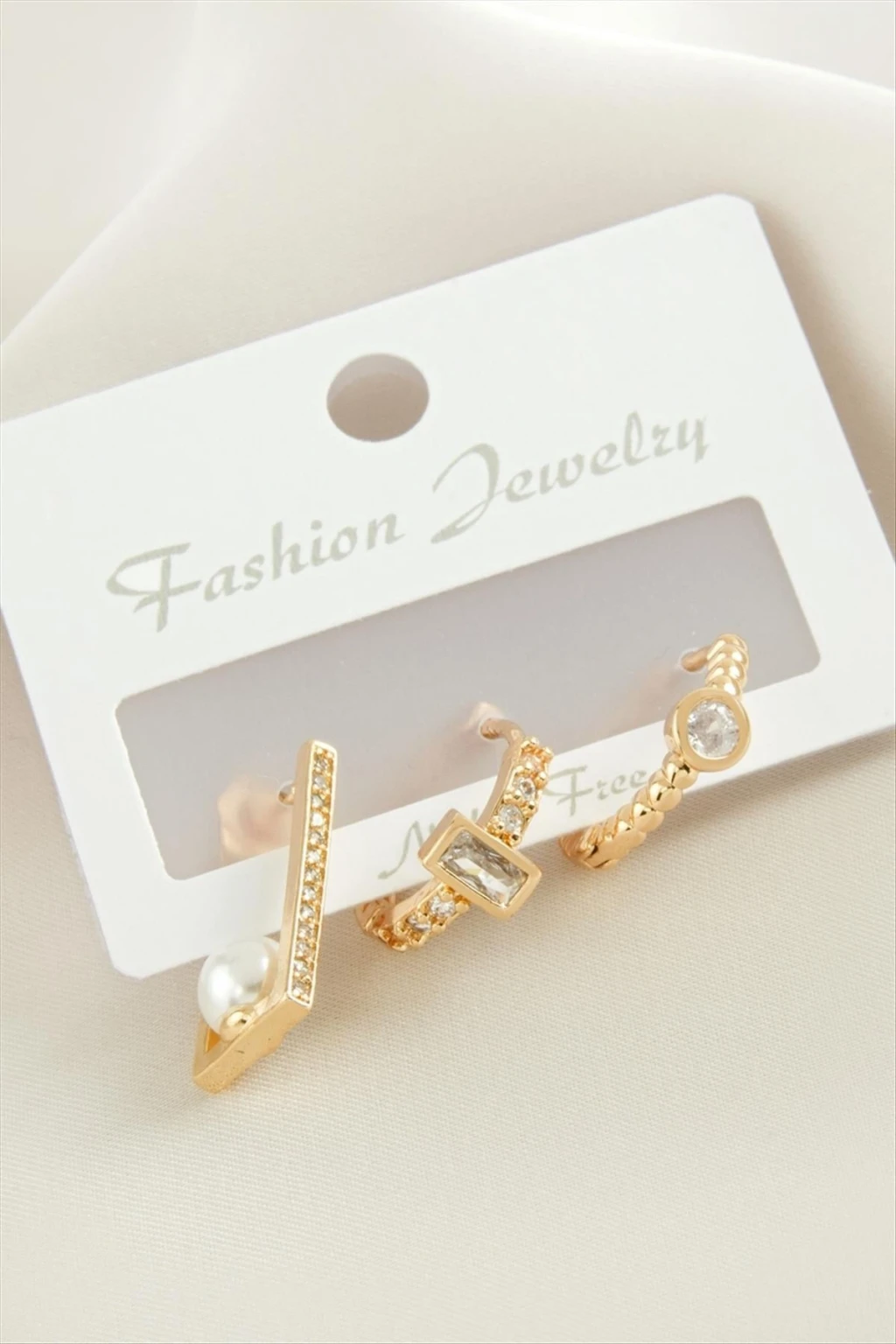 3 Adet Dikdörtgen İnci Zirkon Taşlı Küpe