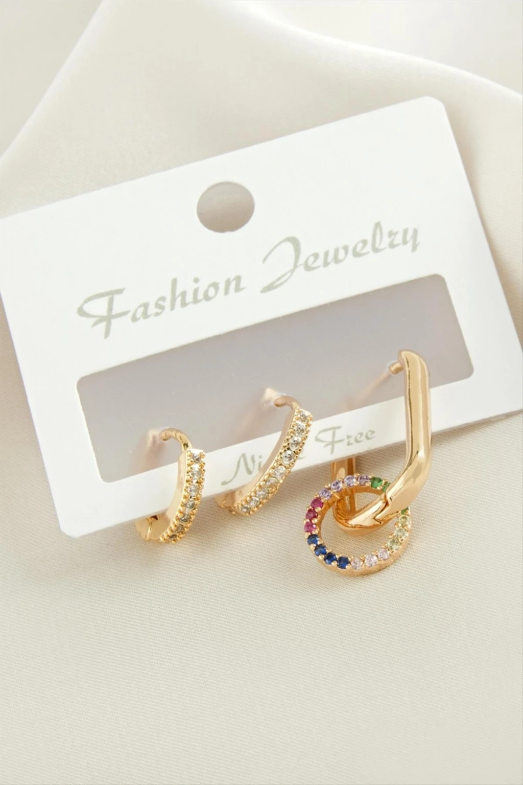 Küpe; Ürün malzemesi metal ve zirkon taşından imal edilmiştir. 1 sınıf kaliteli malzeme kullanılmıştır. Ürün boyu 3 cmdir. 1 kartta 3 adet küpe bulunmaktadır.