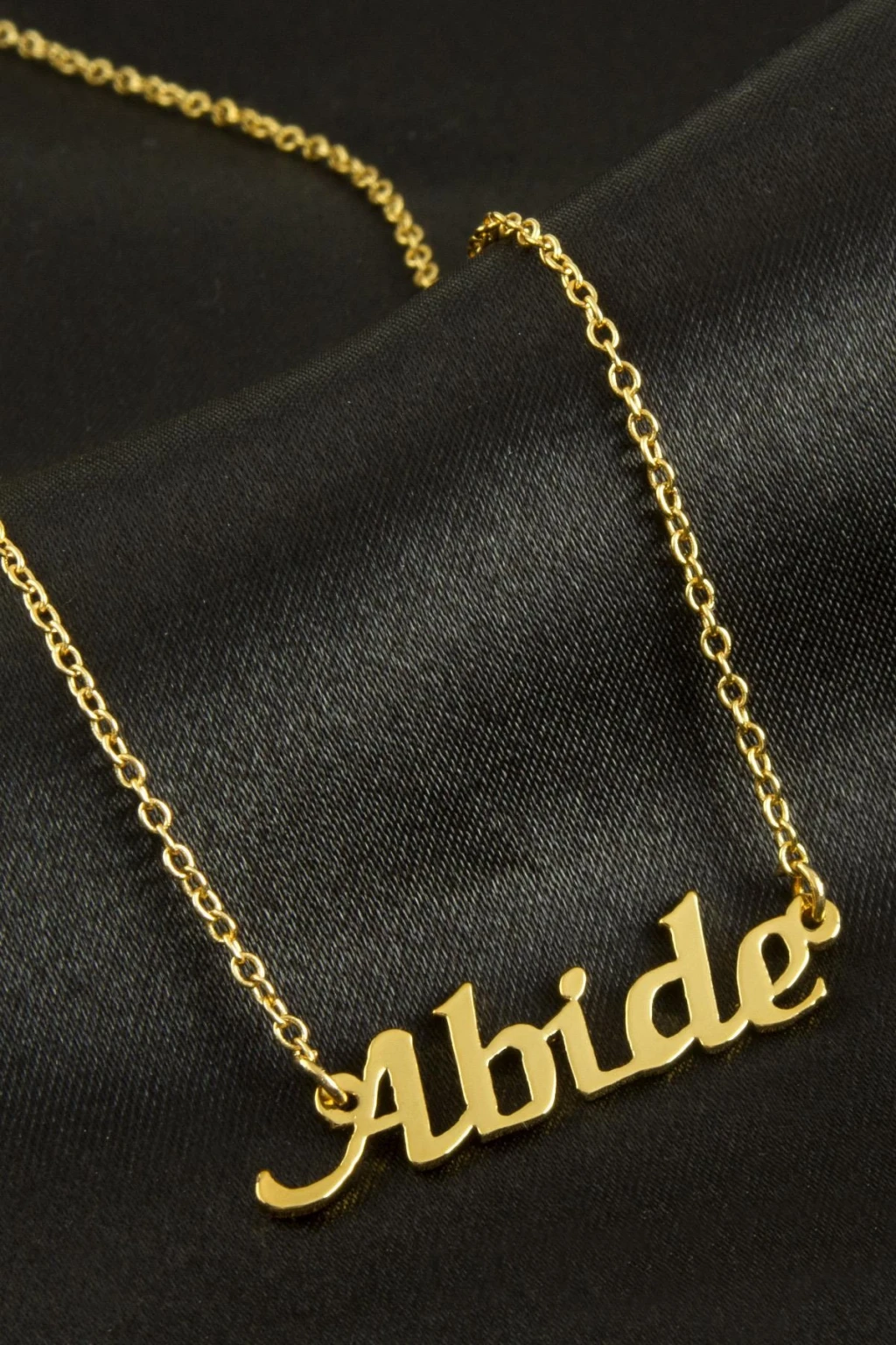 Abide isimli kolye. İsimli kolye pirinç madeninden ve altın kaplamalıdır. Kişiye özel üretilmektedir.Yazdırmak istediğiniz ismi bize mesaj olarak iletmeniz gerekmektedir. Kullanıma bağlı olarak uzun süre kullanıma uygundur. Ürün malzemesi 1.sınıf kalitededir. Ürün ve zinciri sarı renktedir. Ürün zincir boyu 45 cm ve ürün üzerindeki isimler yaklaşık 3 cmdir. İsim boyları ürün ismine göre degişiklik göstermektedir.