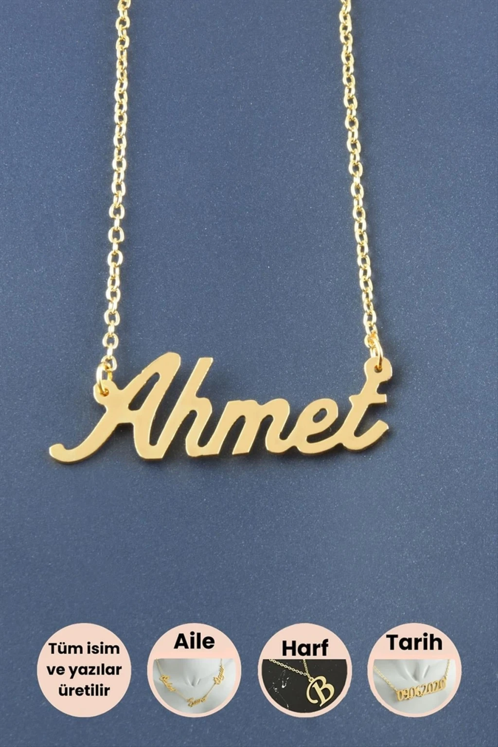 Ahmet İsimli Kolye; İsimli kolye pirinç madeninden ve altın kaplamalıdır. Kişiye özel üretilmektedir. Yazdırmak istediğiniz ismi bize mesaj olarak iletmeniz gerekmektedir.; Kullanıma bağlı olarak uzun süre kullanıma uygundur. Ürün malzemesi 1.sınıf kalitededir. Ürün ve zinciri sarı renktedir. Ürün zincir boyu 45 cm ve ürün üzerindeki isimler yaklaşık 3 cmdir. İsim boyları ürün ismine göre degişiklik göstermektedir.