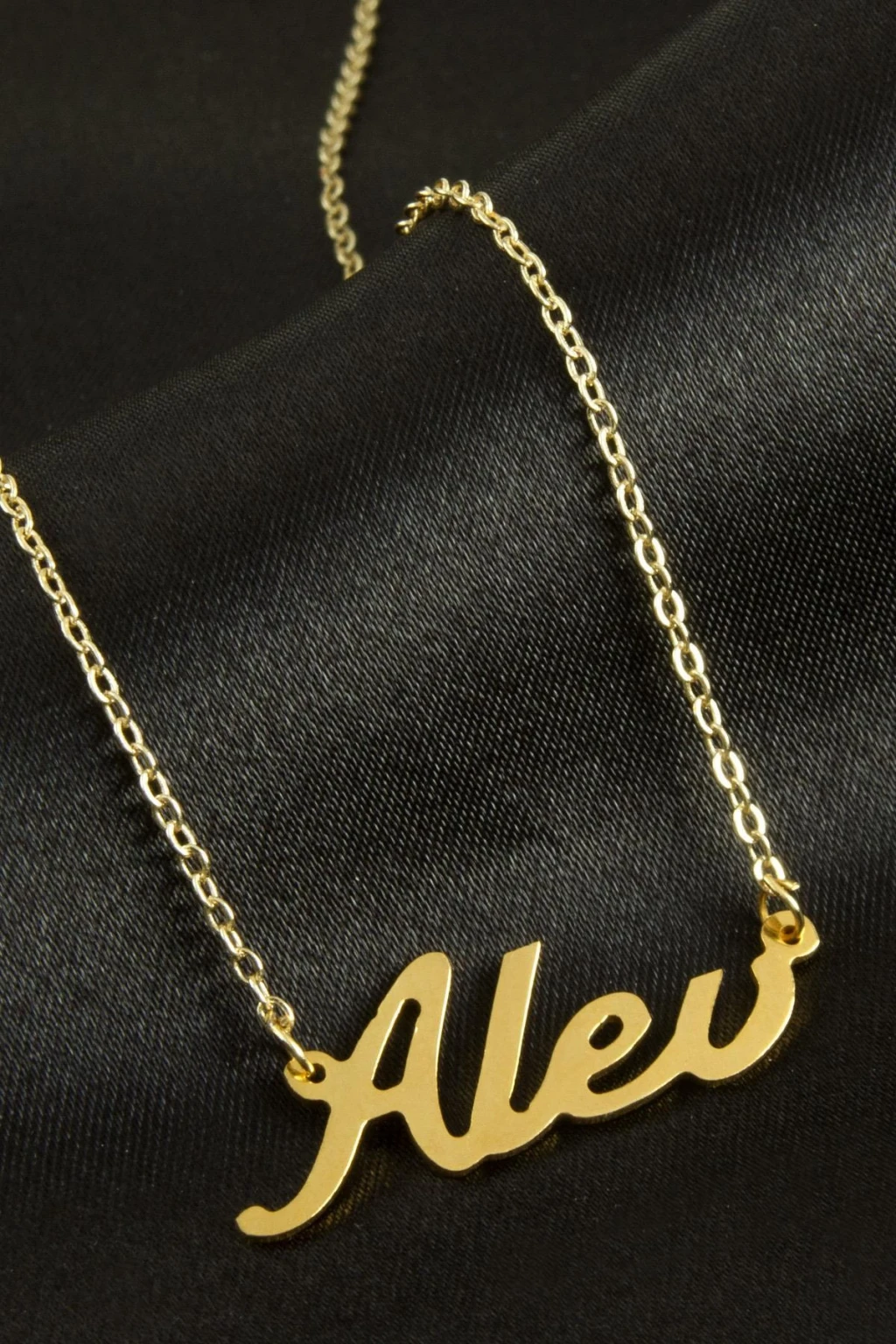 Alev isimli kolye. İsimli kolye pirinç madeninden ve altın kaplamalıdır. Kişiye özel üretilmektedir.Yazdırmak istediğiniz ismi bize mesaj olarak iletmeniz gerekmektedir. Kullanıma bağlı olarak uzun süre kullanıma uygundur. Ürün malzemesi 1.sınıf kalitededir. Ürün ve zinciri sarı renktedir. Ürün zincir boyu 45 cm ve ürün üzerindeki isimler yaklaşık 3 cmdir. İsim boyları ürün ismine göre degişiklik göstermektedir.