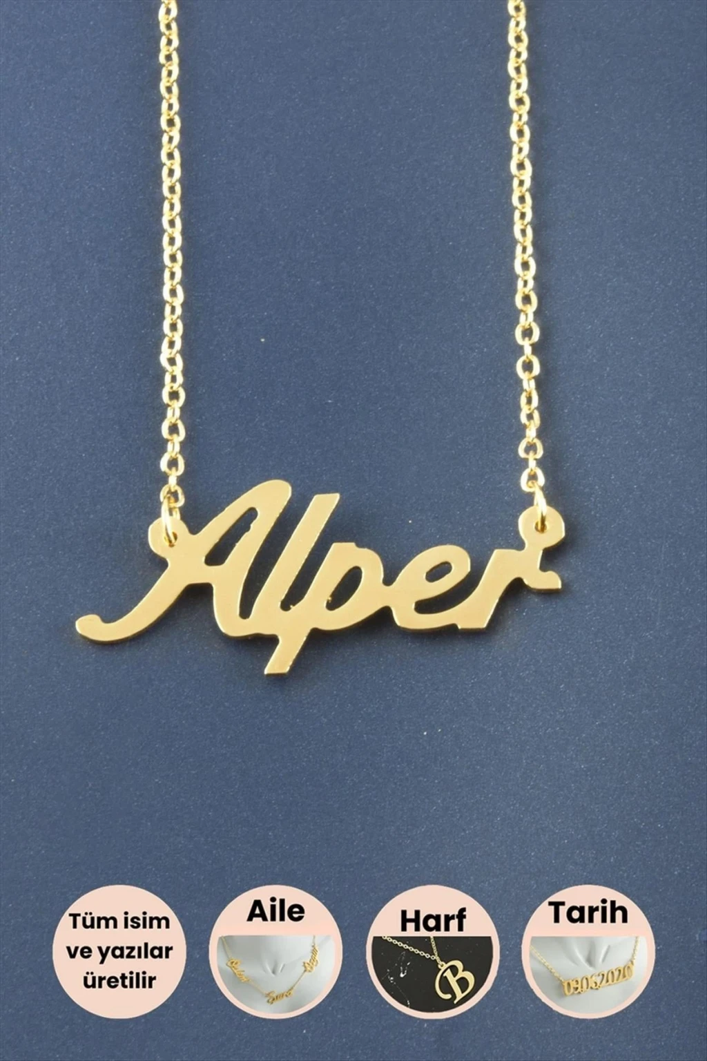 Alper İsimli Kolye.; İsimli kolye pirinç madeninden ve altın kaplamalıdır.; Kişiye özel üretilmektedir.; Yazdırmak istediğiniz ismi bize mesaj olarak iletmeniz gerekmektedir.; Kullanıma bağlı olarak uzun süre kullanıma uygundur.; Ürün malzemesi 1.sınıf kalitededir.; Ürün ve zinciri sarı renktedir.; Ürün zincir boyu 45 cm ve ürün üzerindeki isimler yaklaşık 3 cmdir.; İsim boyları ürün ismine göre degişiklik göstermektedir.