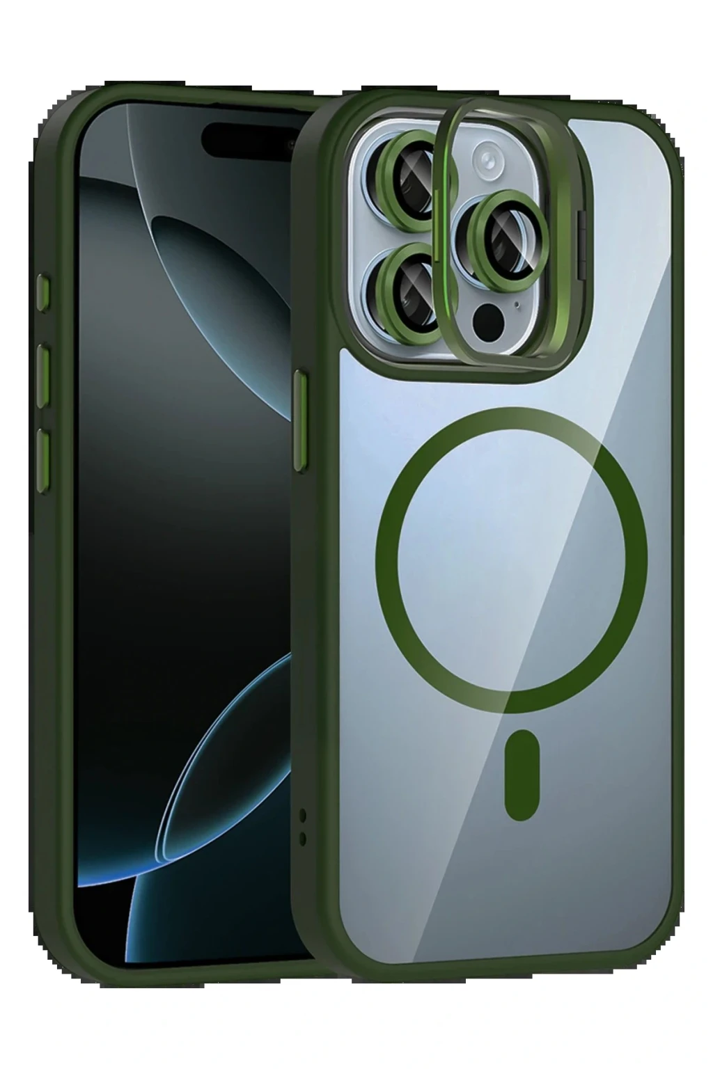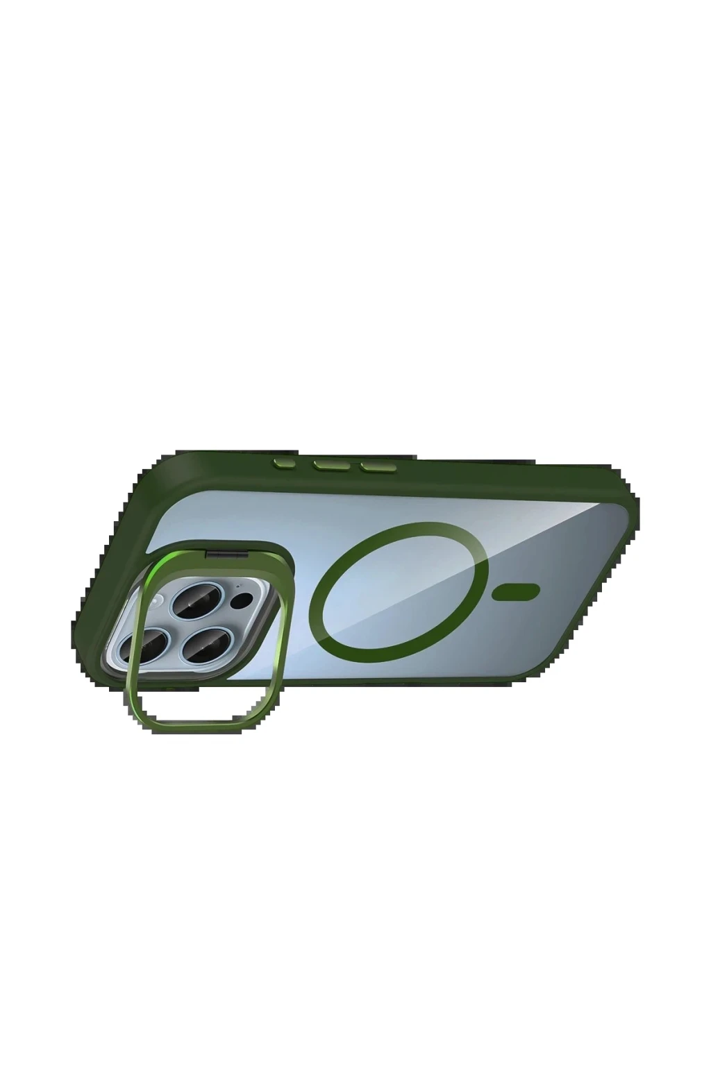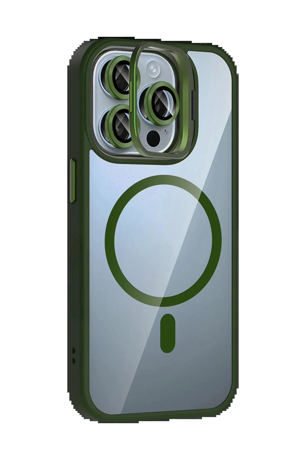 Apple iPhone 14 Pro Max Remim Lensli Magsafe Standlı Kapak - Koyu Yeşil
