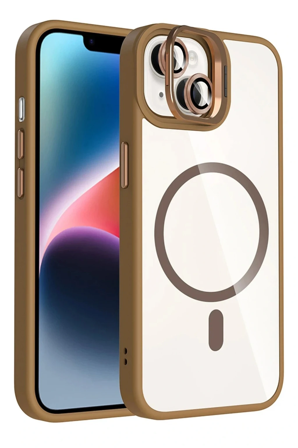 Apple iPhone 14 Remim Lensli Magsafe Standlı Kapak - Kahverengi