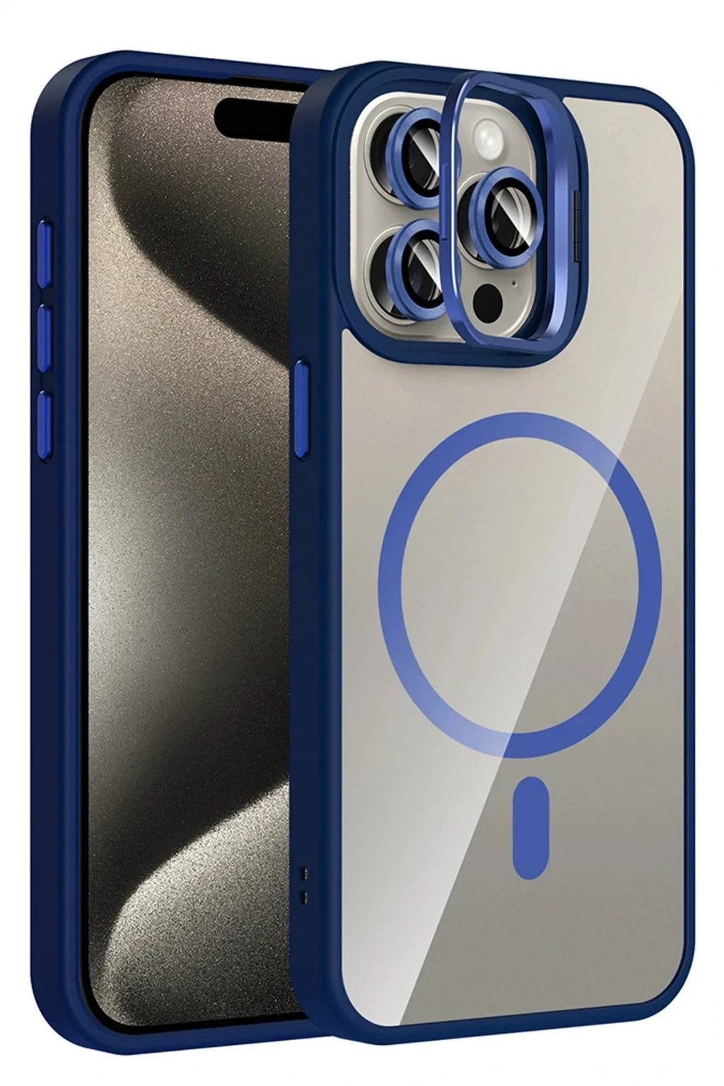 Apple iPhone 15 Pro Max Remim Lensli Magsafe Standlı Kapak - Lacivert