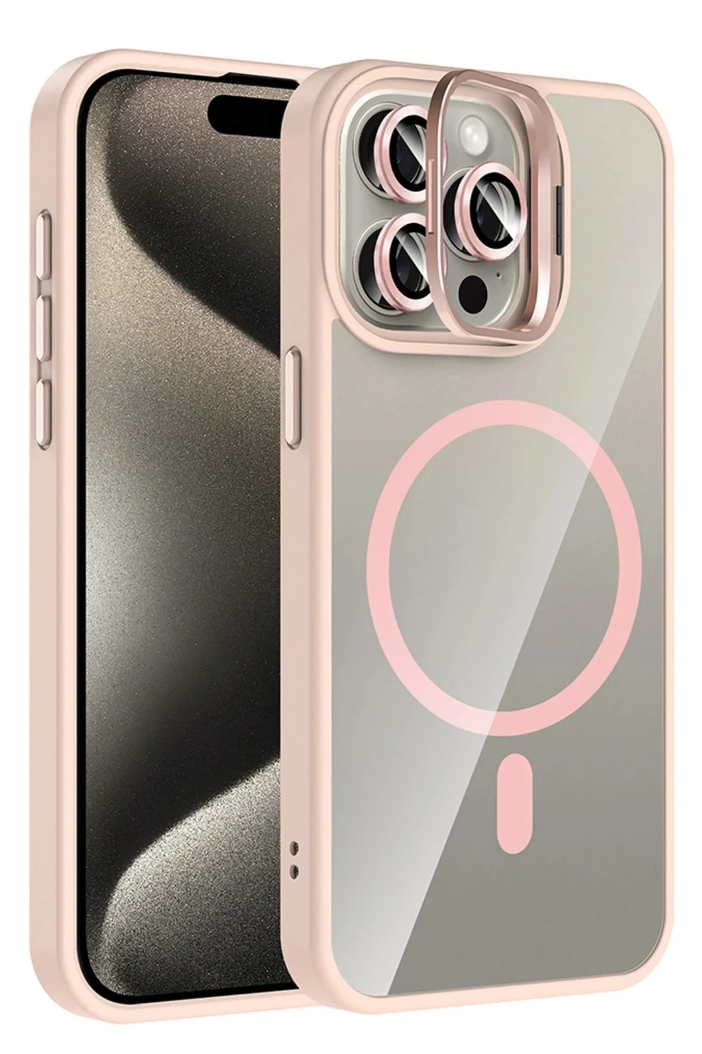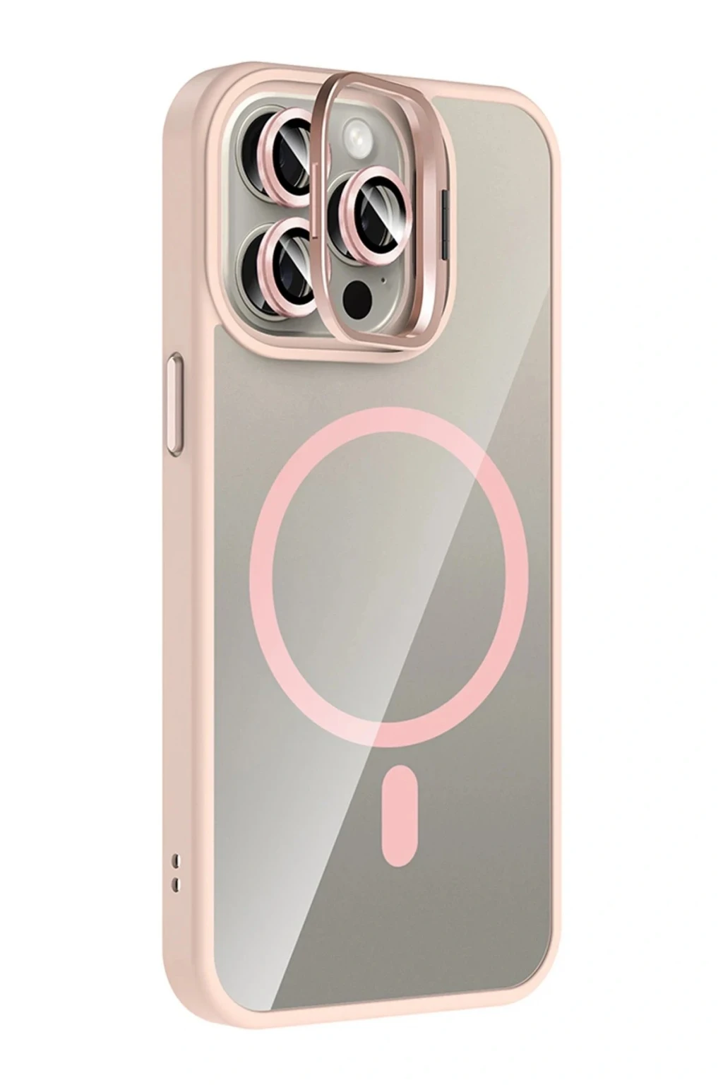 Apple iPhone 15 Pro Max Remim Lensli Magsafe Standlı Kapak - Pembe