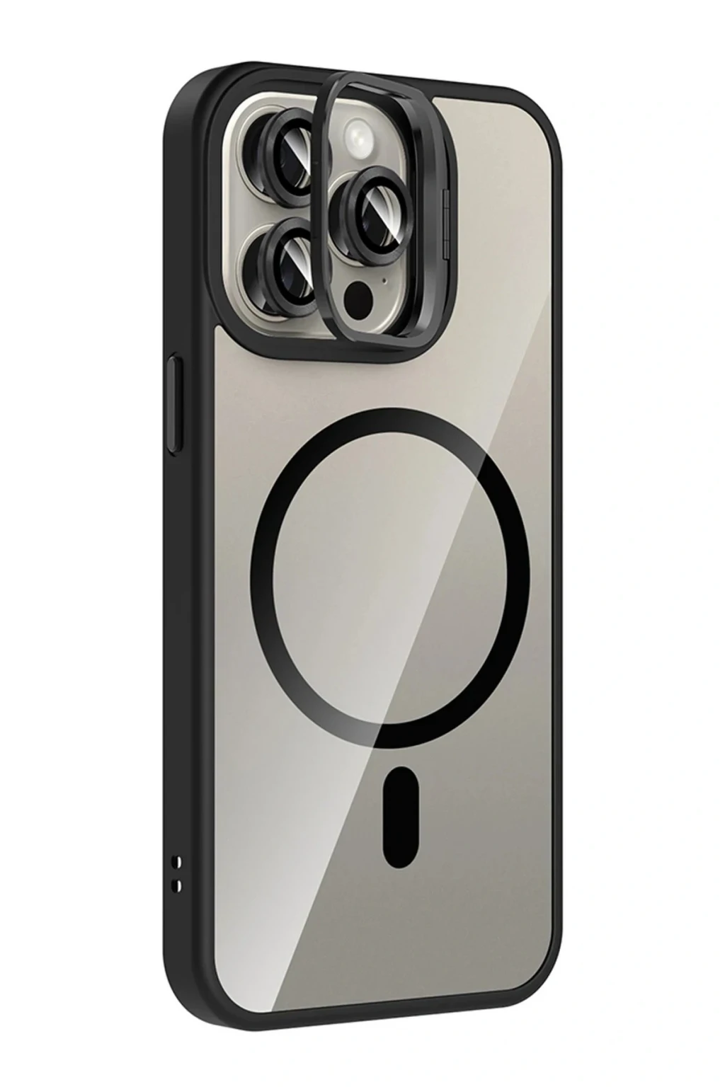Apple iPhone 15 Pro Max Remim Lensli Magsafe Standlı Kapak - Siyah
