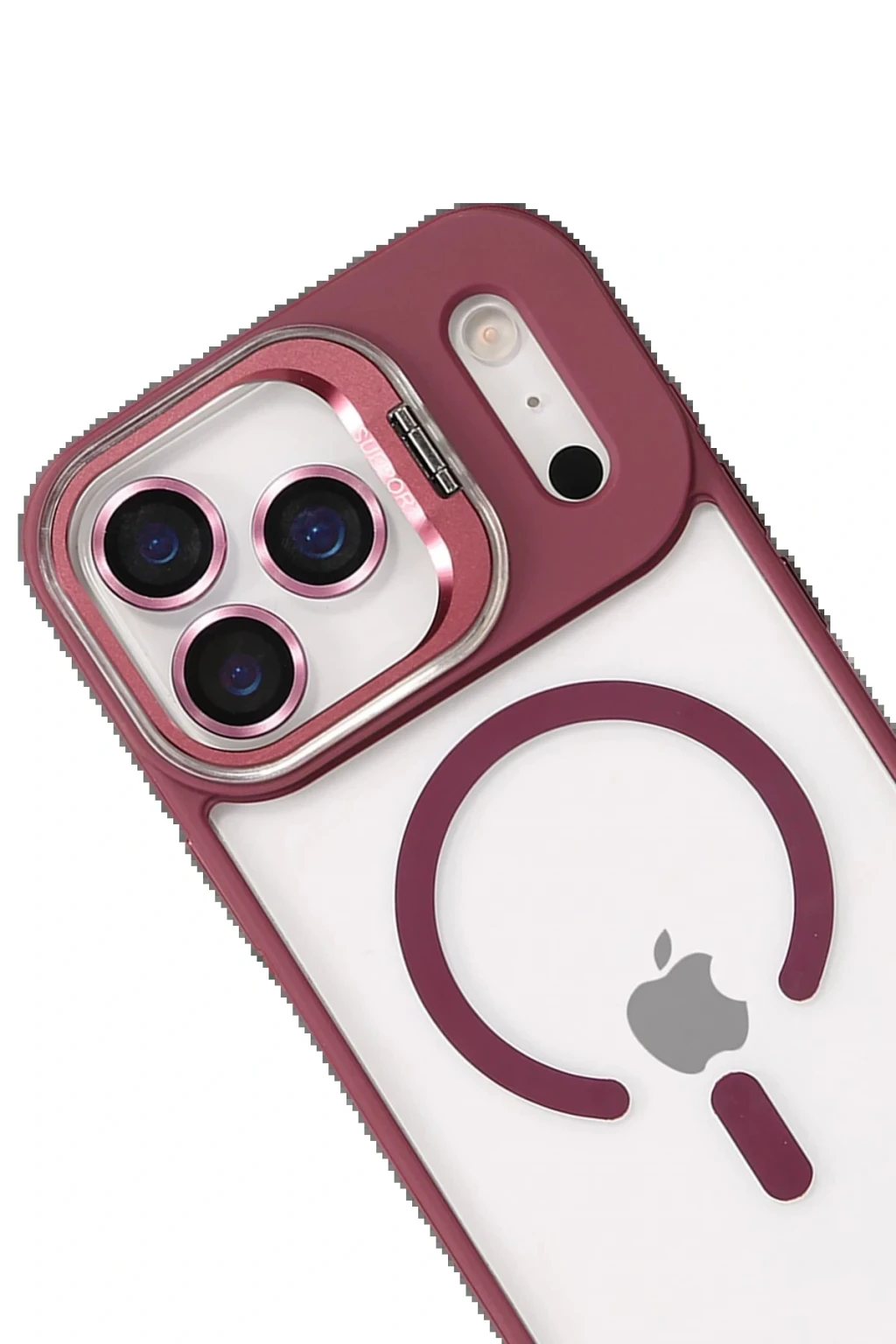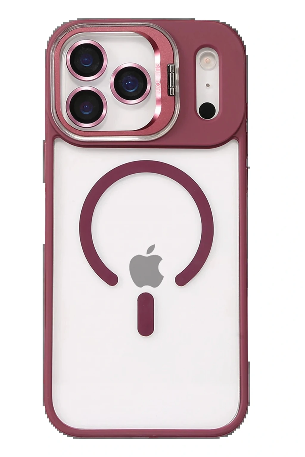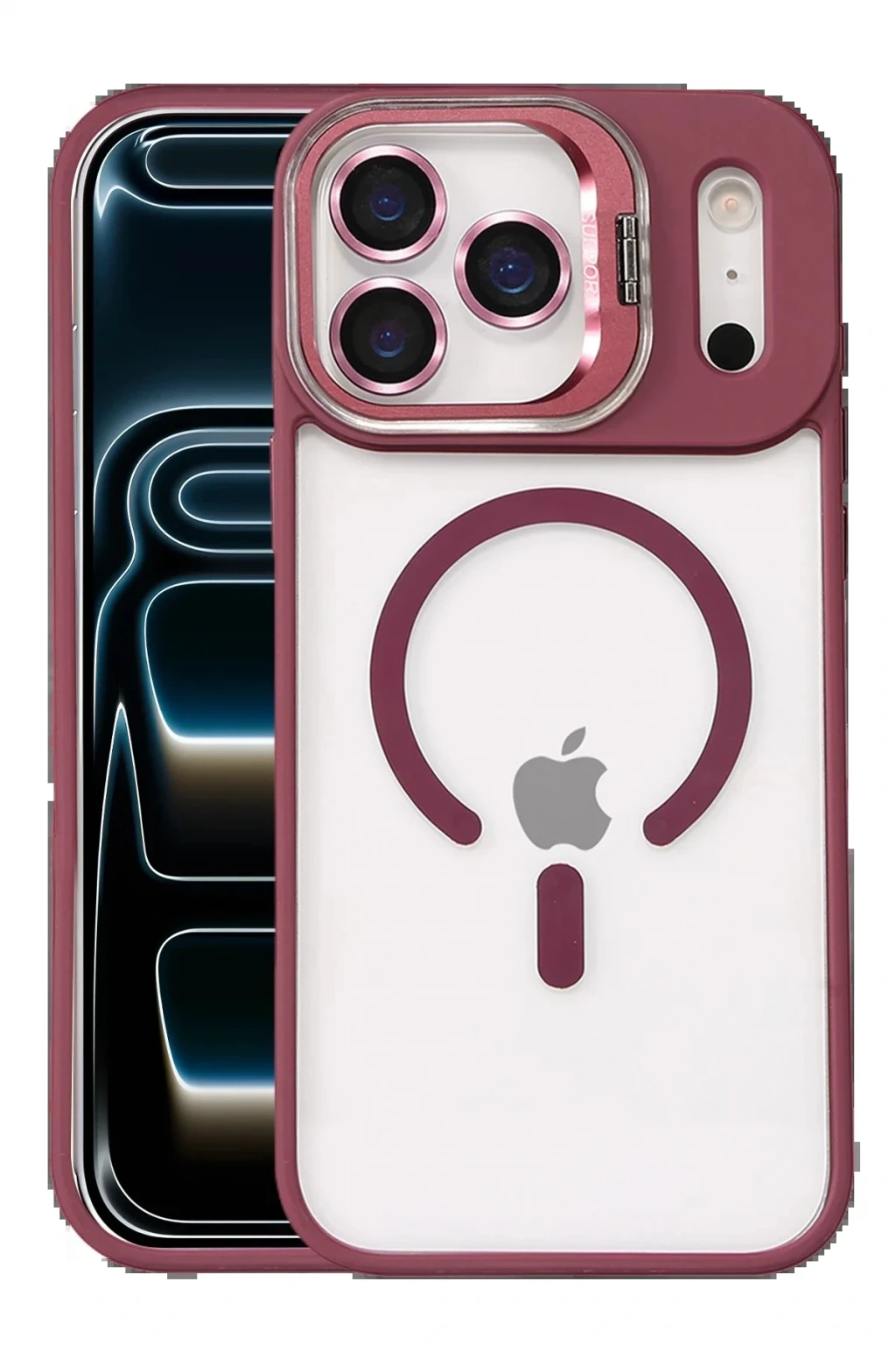 Apple iPhone 17 Pro Max Remim Lensli Magsafe Standlı Kapak - Bordo