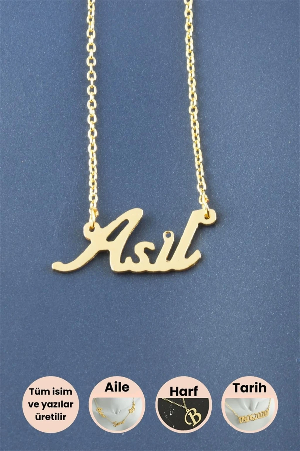 Asil İsimli Kolye.; İsimli kolye pirinç madeninden ve altın kaplamalıdır. Kişiye özel üretilmektedir. Yazdırmak istediğiniz ismi bize mesaj olarak iletmeniz gerekmektedir.; Kullanıma bağlı olarak uzun süre kullanıma uygundur. Ürün malzemesi 1.sınıf kalitededir. Ürün ve zinciri sarı renktedir. Ürün zincir boyu 45 cm ve ürün üzerindeki isimler yaklaşık 3 cmdir. İsim boyları ürün ismine göre degişiklik göstermektedir.