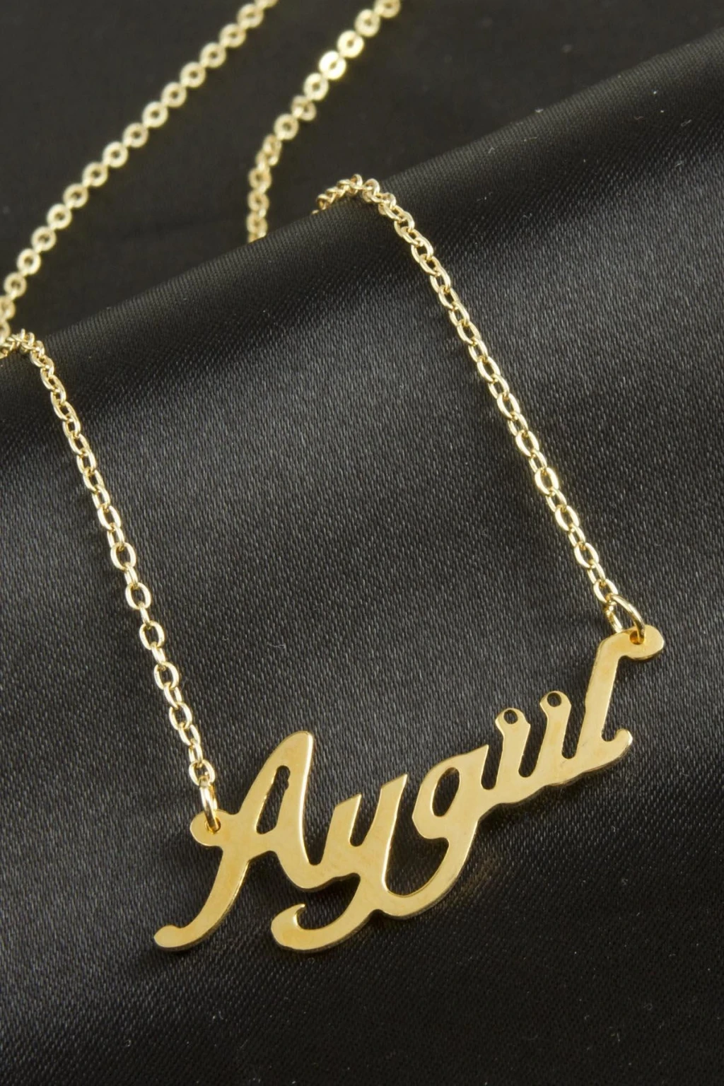 Aygül isimli kolye. İsimli kolye pirinç madeninden ve altın kaplamalıdır. Kişiye özel üretilmektedir.Yazdırmak istediğiniz ismi bize mesaj olarak iletmeniz gerekmektedir. Kullanıma bağlı olarak uzun süre kullanıma uygundur. Ürün malzemesi 1.sınıf kalitededir. Ürün ve zinciri sarı renktedir. Ürün zincir boyu 45 cm ve ürün üzerindeki isimler yaklaşık 3 cmdir. İsim boyları ürün ismine göre degişiklik göstermektedir.