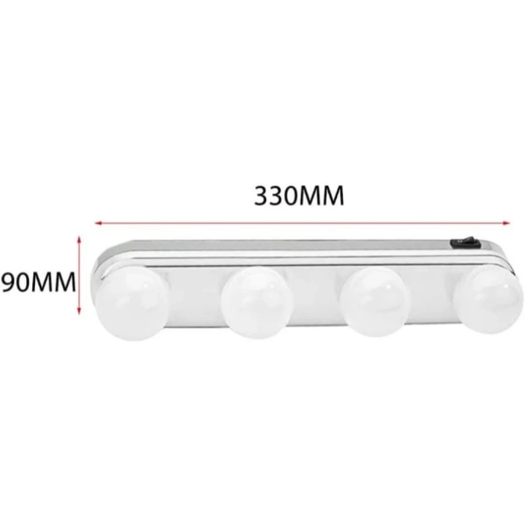AYNA MAKYAJ IŞIĞIÜrün ÖzellikleriAyna Makyaj Işığı, güçlü ve homojen aydınlatma sağlayan 4’lü LED ampul tasarımıyla makyaj uygulamalarında profesyonel bir ışık deneyimi sunar. 330 mm genişliğe ve 90 mm yüksekliğe sahip kompakt yapısı sayesinde her boyutta ayna ile rahatlıkla kullanılabilir. Pil ile çalıştığı için kablo karmaşasına gerek kalmaz ve istenilen her yere kolayca taşınarak kullanılabilir. Doğal beyaz ışığı yüz hatlarını netleştirir, makyajda renk tonlarının daha doğru görünmesini sağlar. Makyaj masaları, banyo aynaları, giyinme alanları ve taşınabilir kullanım için ideal bir çözüm sunar. Hem pratik hem de estetik yapısıyla makyaj rutinini kolaylaştıran kullanışlı bir yardımcıdır.Paket İçeriği1 Adet Ayna Makyaj Işığı