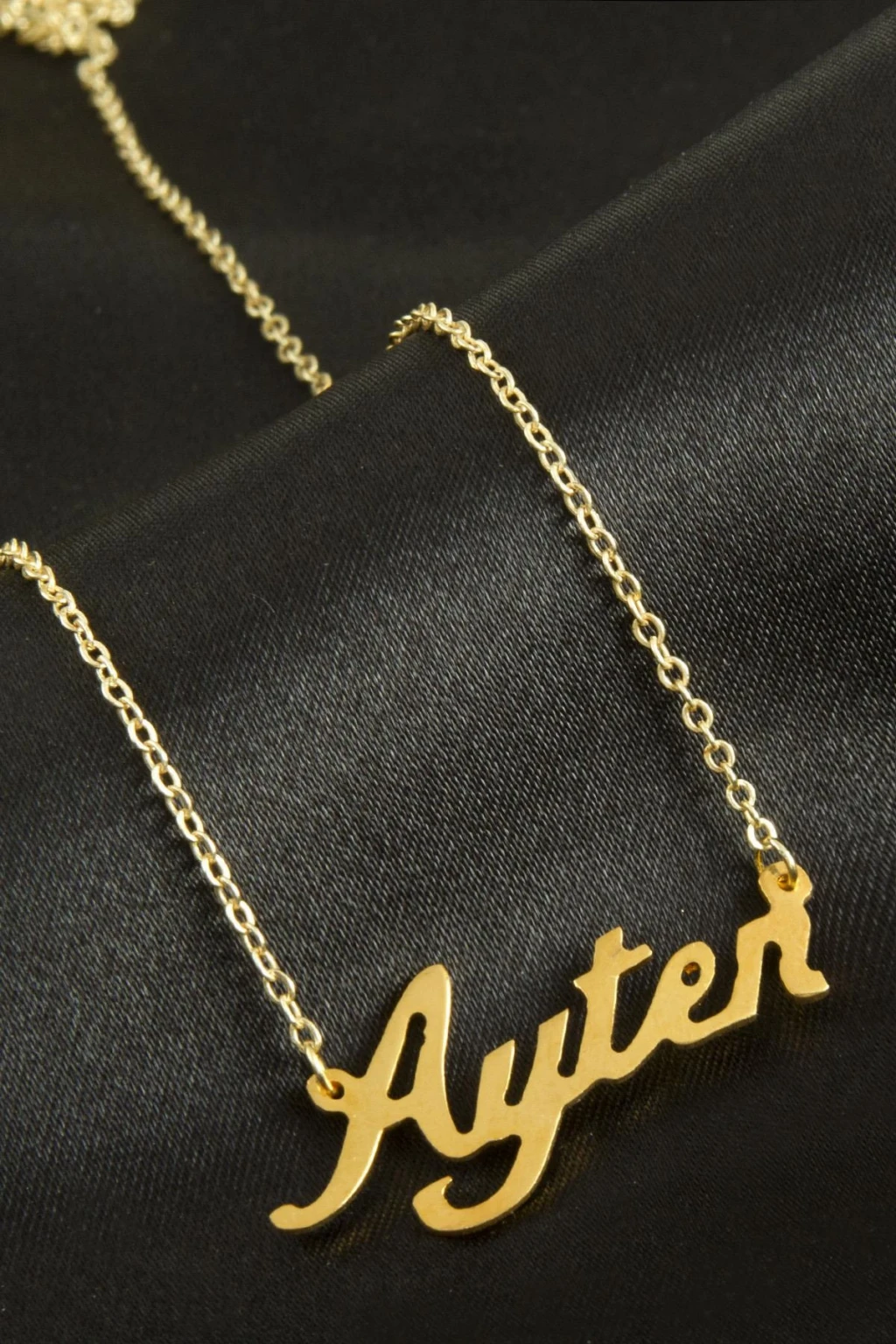 Ayten isimli kolye. İsimli kolye pirinç madeninden ve altın kaplamalıdır. Kişiye özel üretilmektedir.Yazdırmak istediğiniz ismi bize mesaj olarak iletmeniz gerekmektedir. Kullanıma bağlı olarak uzun süre kullanıma uygundur. Ürün malzemesi 1.sınıf kalitededir. Ürün ve zinciri sarı renktedir. Ürün zincir boyu 45 cm ve ürün üzerindeki isimler yaklaşık 3 cmdir. İsim boyları ürün ismine göre degişiklik göstermektedir.