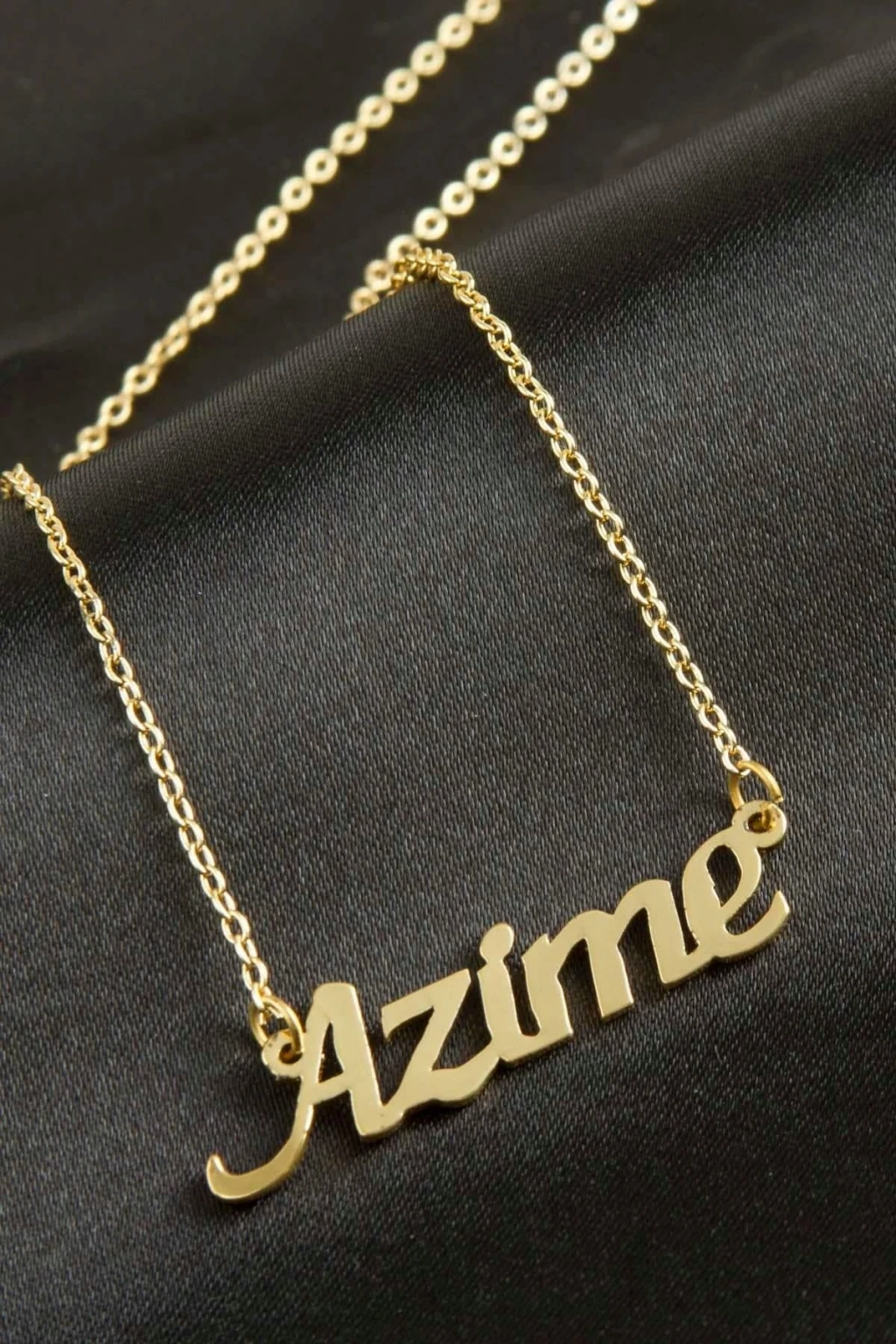 Azime isimli kolye. İsimli kolye pirinç madeninden ve altın kaplamalıdır. Kişiye özel üretilmektedir.Yazdırmak istediğiniz ismi bize mesaj olarak iletmeniz gerekmektedir. Kullanıma bağlı olarak uzun süre kullanıma uygundur. Ürün malzemesi 1.sınıf kalitededir. Ürün ve zinciri sarı renktedir. Ürün zincir boyu 45 cm ve ürün üzerindeki isimler yaklaşık 3 cmdir. İsim boyları ürün ismine göre degişiklik göstermektedir.