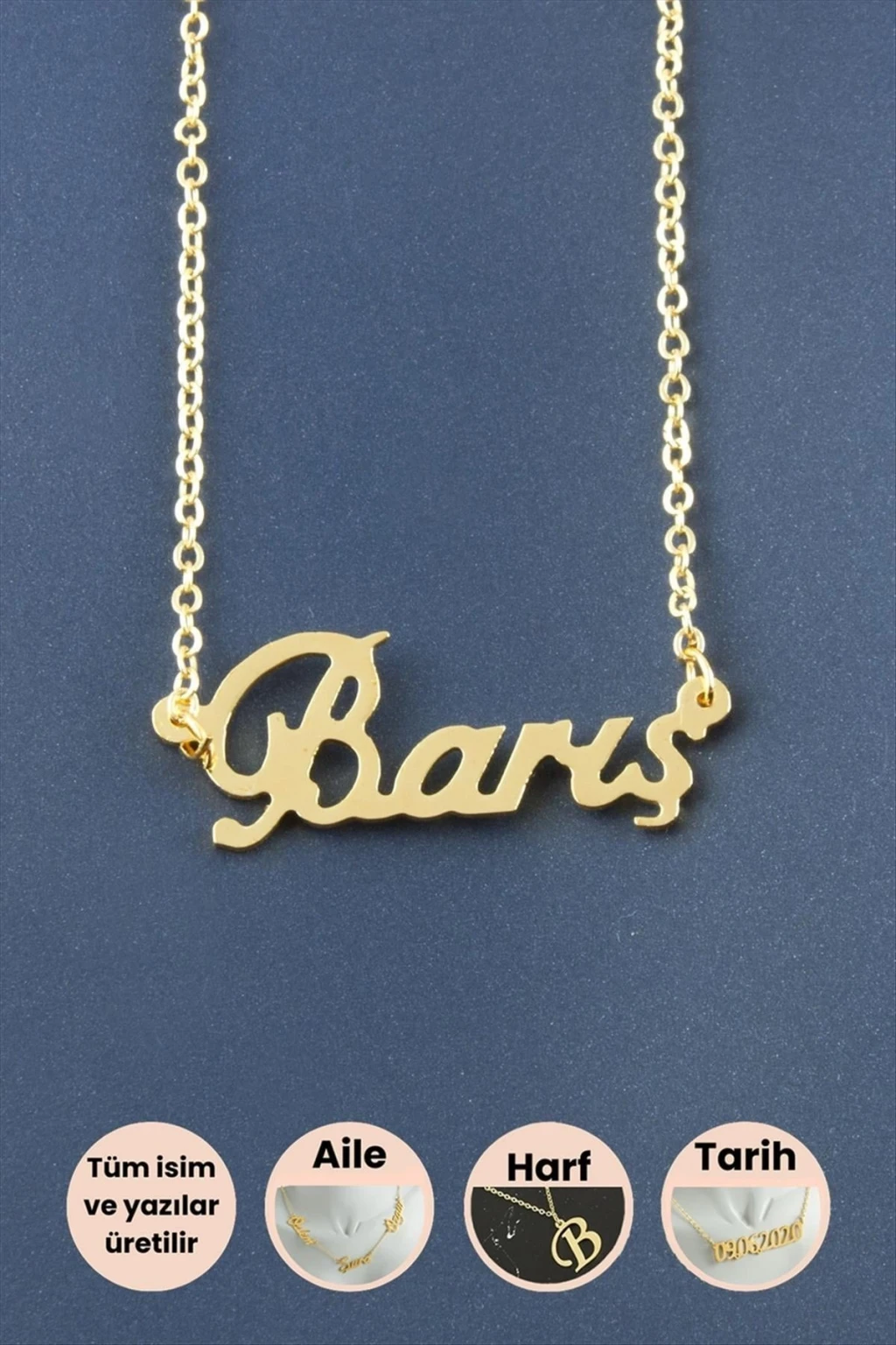 Barış İsimli Kolye; İsimli kolye pirinç madeninden ve altın kaplamalıdır. Kişiye özel üretilmektedir. Yazdırmak istediğiniz ismi bize mesaj olarak iletmeniz gerekmektedir.; Kullanıma bağlı olarak uzun süre kullanıma uygundur. Ürün malzemesi 1.sınıf kalitededir. Ürün ve zinciri sarı renktedir. Ürün zincir boyu 45 cm ve ürün üzerindeki isimler yaklaşık 3 cmdir. İsim boyları ürün ismine göre degişiklik göstermektedir.
