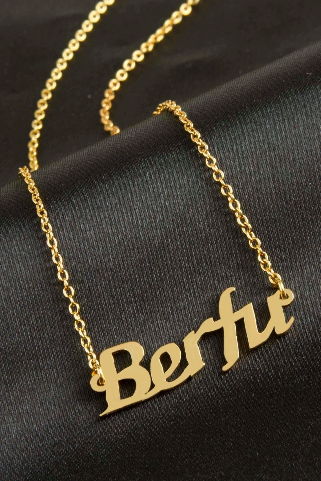 Berfu isimli kolye. İsimli kolye pirinç madeninden ve altın kaplamalıdır. Kişiye özel üretilmektedir.Yazdırmak istediğiniz ismi bize mesaj olarak iletmeniz gerekmektedir. Kullanıma bağlı olarak uzun süre kullanıma uygundur. Ürün malzemesi 1.sınıf kalitededir. Ürün ve zinciri sarı renktedir. Ürün zincir boyu 45 cm ve ürün üzerindeki isimler yaklaşık 3 cmdir. İsim boyları ürün ismine göre degişiklik göstermektedir.