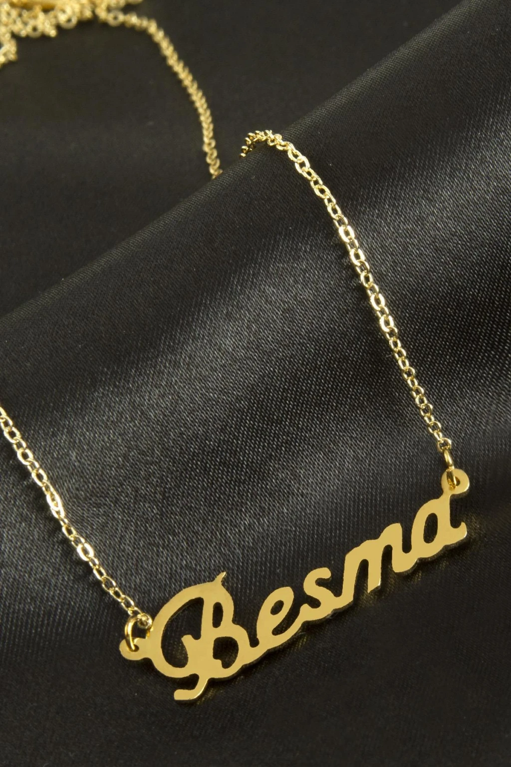 Besma İsimli Kolye. İsimli kolye pirinç madeninden ve altın kaplamalıdır. Kişiye özel üretilmektedir.Yazdırmak istediğiniz ismi bize mesaj olarak iletmeniz gerekmektedir. Kullanıma bağlı olarak uzun süre kullanıma uygundur. Ürün malzemesi 1.sınıf kalitededir. Ürün ve zinciri sarı renktedir. Ürün zincir boyu 45 cm ve ürün üzerindeki isimler yaklaşık 3 cmdir. İsim boyları ürün ismine göre degişiklik göstermektedir.