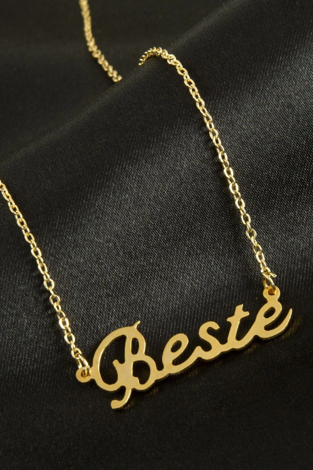 Beste isimli kolye. İsimli kolye pirinç madeninden ve altın kaplamalıdır. Kişiye özel üretilmektedir.Yazdırmak istediğiniz ismi bize mesaj olarak iletmeniz gerekmektedir. Kullanıma bağlı olarak uzun süre kullanıma uygundur. Ürün malzemesi 1.sınıf kalitededir. Ürün ve zinciri sarı renktedir. Ürün zincir boyu 45 cm ve ürün üzerindeki isimler yaklaşık 3 cmdir. İsim boyları ürün ismine göre degişiklik göstermektedir.