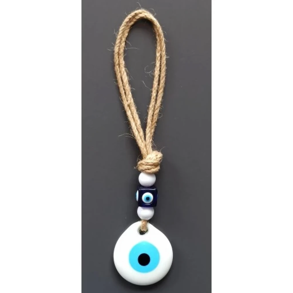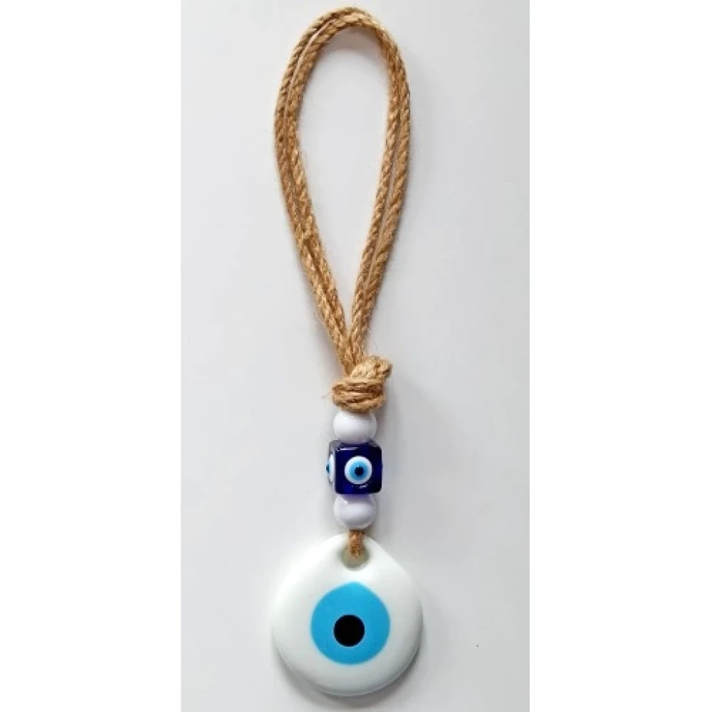 Beyaz nazar boncuklu duvar süsümüz tamamen el işçiliği ile birinci kalite malzemeden üretilmiştir. Beyaz nazar boncuğu 4,5 santimetre çapındadır. Ürünümüz 22 santimetre uzunluğundadır.