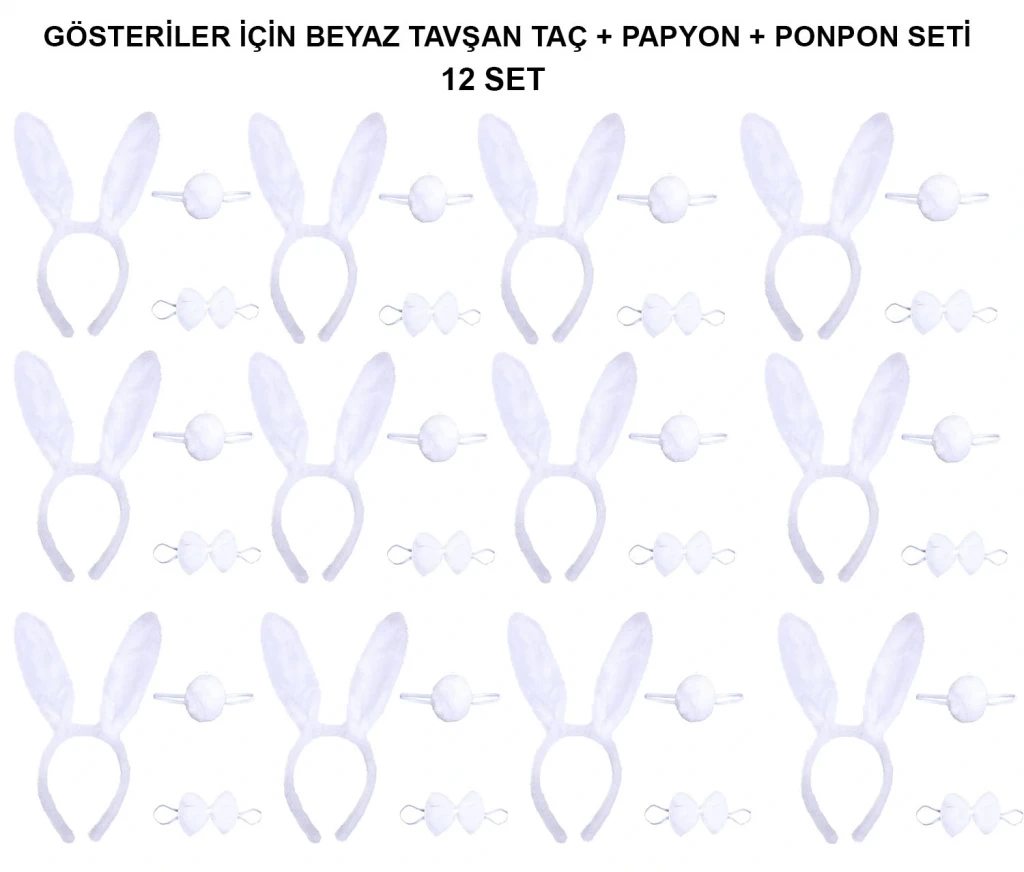 Beyaz Tavşan Kostüm Seti – Taç, Papyon, Kuyruk (12’li Paket)