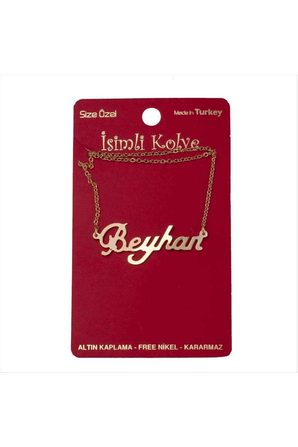 Beyhan isimli kolye. İsimli kolye pirinç madeninden ve altın kaplamalıdır. Kişiye özel üretilmektedir.Yazdırmak istediğiniz ismi bize mesaj olarak iletmeniz gerekmektedir. Kullanıma bağlı olarak uzun süre kullanıma uygundur. Ürün malzemesi 1.sınıf kalitededir. Ürün ve zinciri sarı renktedir. Ürün zincir boyu 45 cm ve ürün üzerindeki isimler yaklaşık 3 cmdir. İsim boyları ürün ismine göre degişiklik göstermektedir.