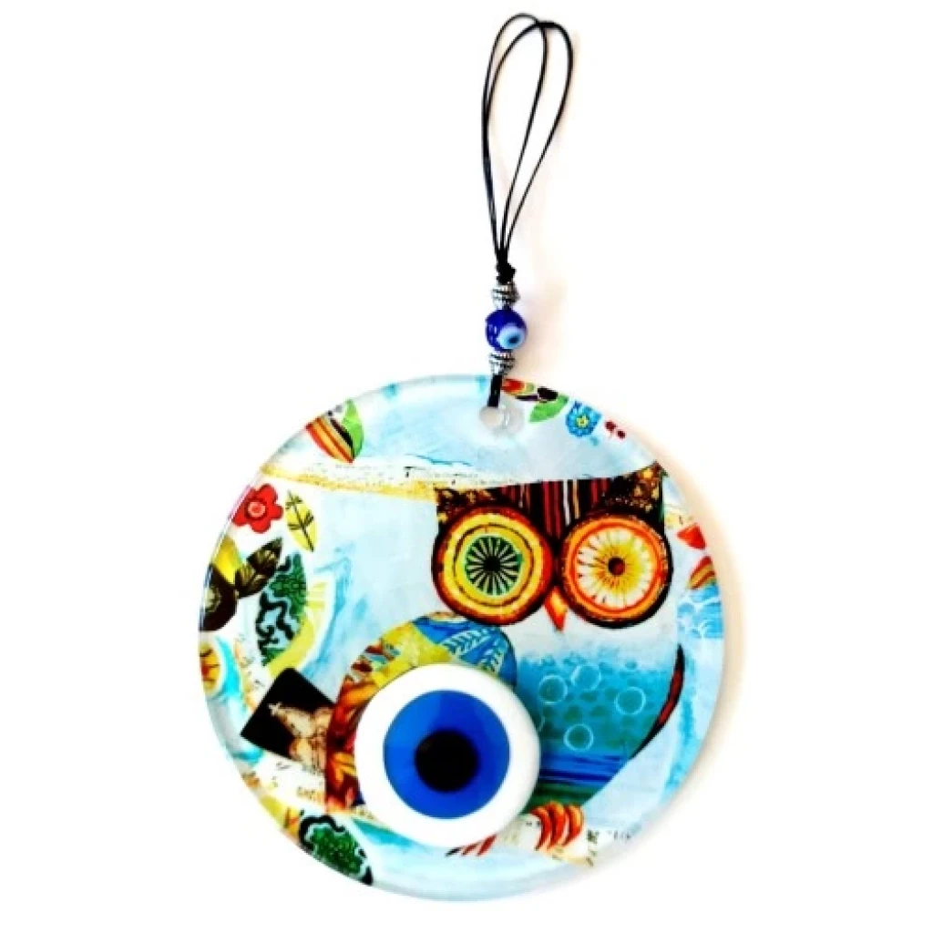 Bilgin Baykuş Nazar Boncuklu 12 Santimetre Füzyon Cam Duvar Süsü