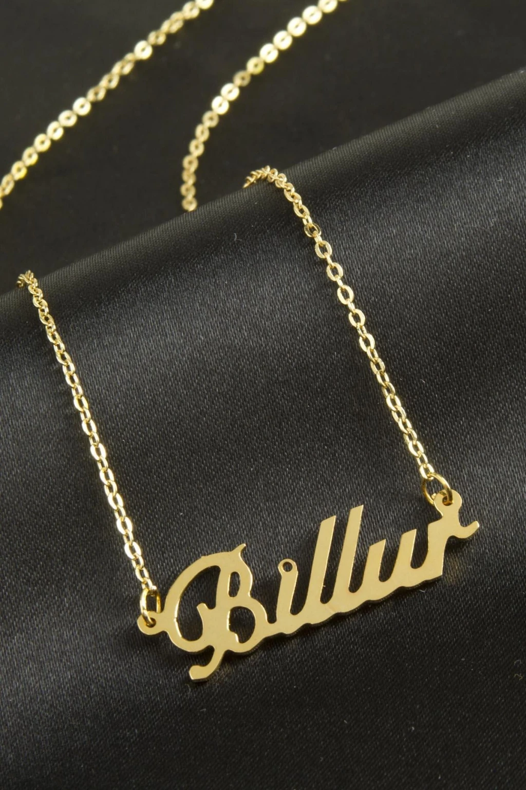 Billur isimli kolye. İsimli kolye pirinç madeninden ve altın kaplamalıdır. Kişiye özel üretilmektedir.Yazdırmak istediğiniz ismi bize mesaj olarak iletmeniz gerekmektedir. Kullanıma bağlı olarak uzun süre kullanıma uygundur. Ürün malzemesi 1.sınıf kalitededir. Ürün ve zinciri sarı renktedir. Ürün zincir boyu 45 cm ve ürün üzerindeki isimler yaklaşık 3 cmdir. İsim boyları ürün ismine göre degişiklik göstermektedir.