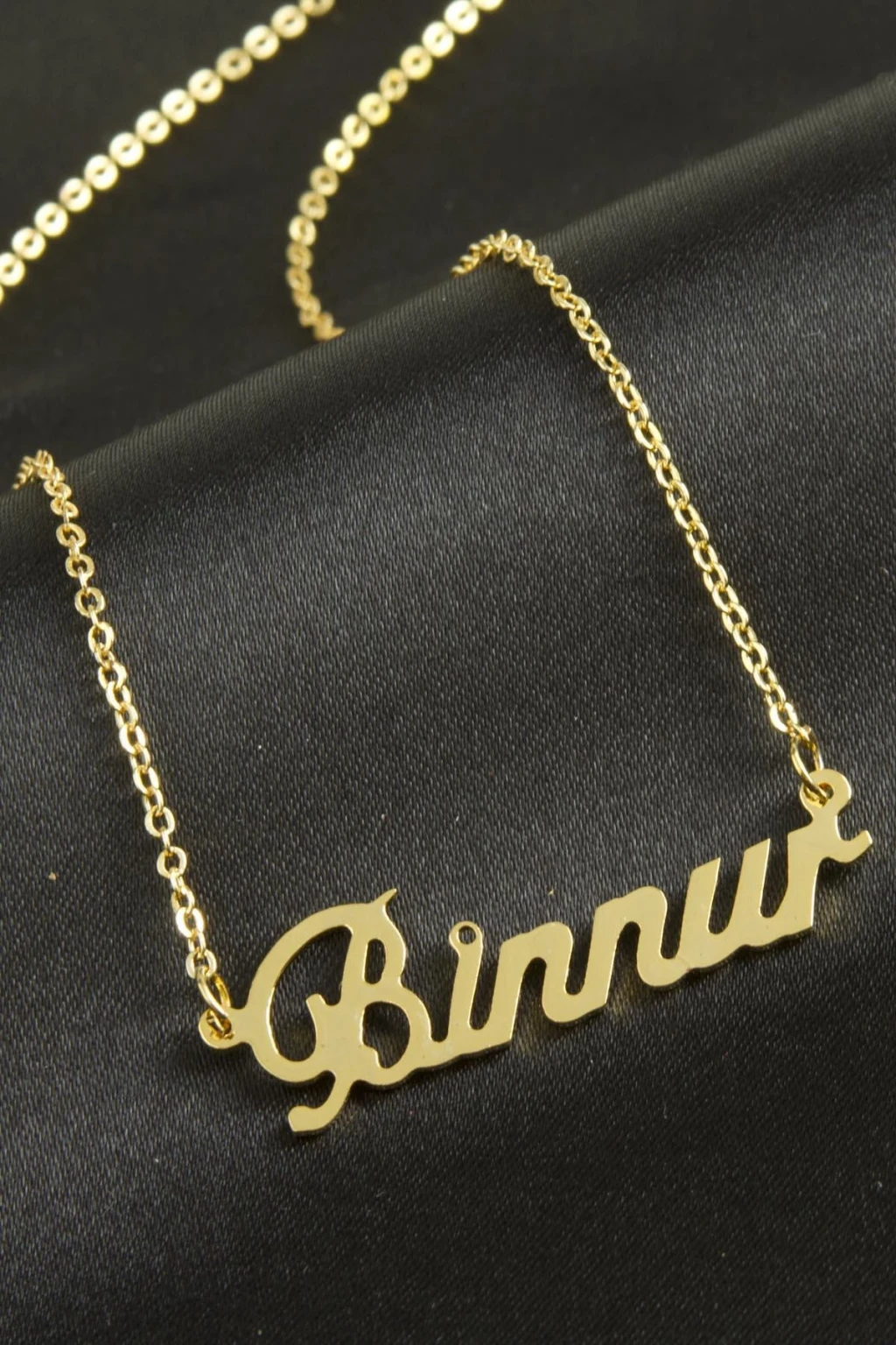 Binnur isimli kolye. İsimli kolye pirinç madeninden ve altın kaplamalıdır. Kişiye özel üretilmektedir.Yazdırmak istediğiniz ismi bize mesaj olarak iletmeniz gerekmektedir. Kullanıma bağlı olarak uzun süre kullanıma uygundur. Ürün malzemesi 1.sınıf kalitededir. Ürün ve zinciri sarı renktedir. Ürün zincir boyu 45 cm ve ürün üzerindeki isimler yaklaşık 3 cmdir. İsim boyları ürün ismine göre degişiklik göstermektedir.