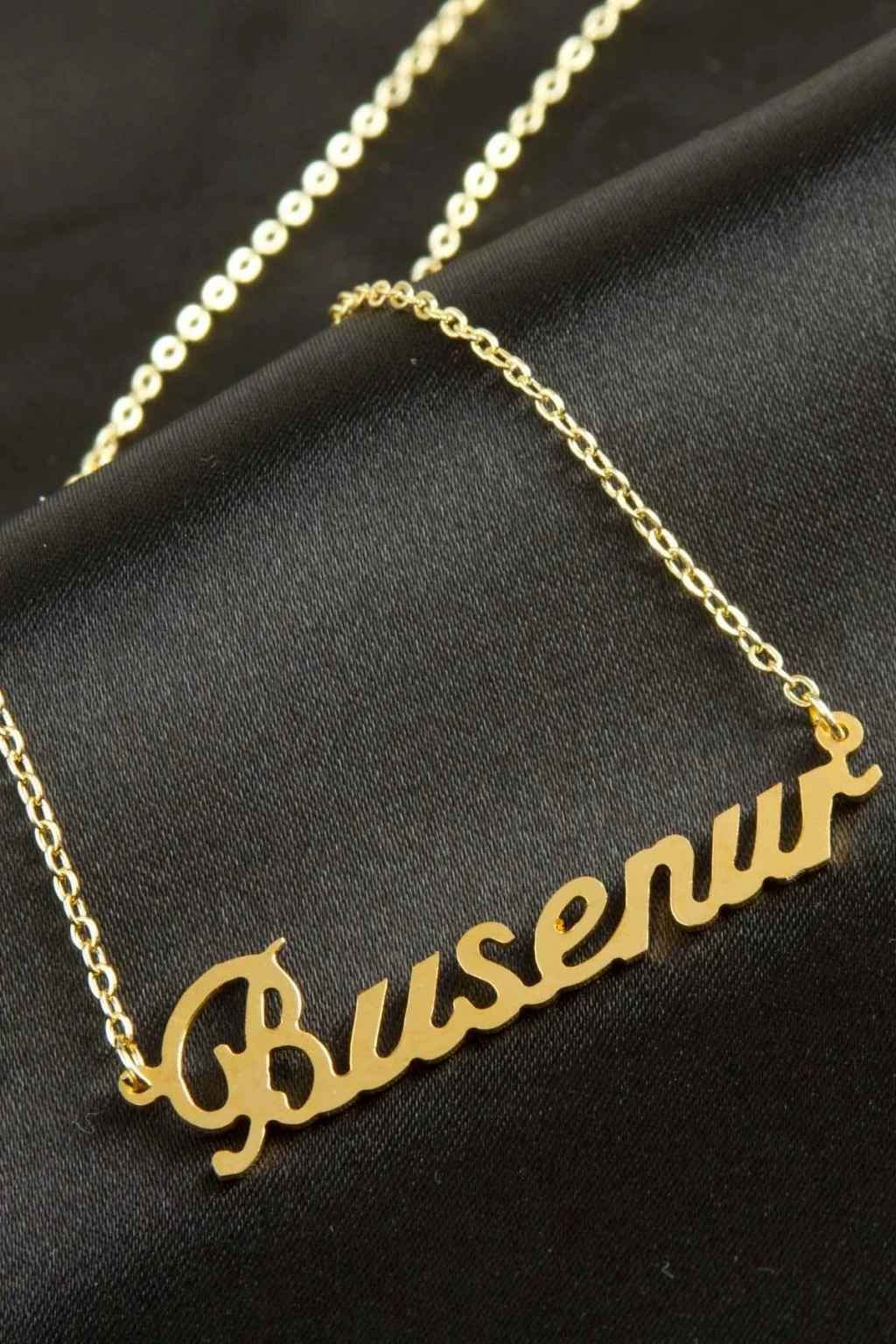 Busenur isimli kolye. İsimli kolye pirinç madeninden ve altın kaplamalıdır. Kişiye özel üretilmektedir.Yazdırmak istediğiniz ismi bize mesaj olarak iletmeniz gerekmektedir. Kullanıma bağlı olarak uzun süre kullanıma uygundur. Ürün malzemesi 1.sınıf kalitededir. Ürün ve zinciri sarı renktedir. Ürün zincir boyu 45 cm ve ürün üzerindeki isimler yaklaşık 3 cmdir. İsim boyları ürün ismine göre degişiklik göstermektedir.