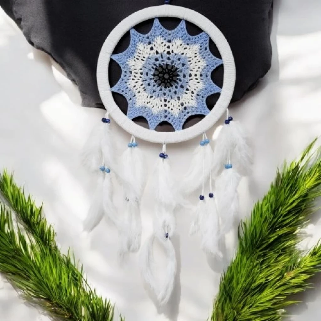 Ürünümüzün yuvarlak kısmı 28 santimetre çapındadır. Ürünümüz ip dahil yaklaşık 70 santimetre boyundadır. Ürünümüz kuş tüyleri ile süslenmiştir. Ürünümüzde doğal ip kullanılmaktadır.Nazar boncuğunun koruyucu özelliğiyle birleşen buz mavisi ve kuş tüylerinin hafifliği, bu duvar süsünü benzersiz kılıyor. Hem modern hem de geleneksel dekorasyonlara uyum sağlayan bu ürün, evinizin her köşesini güzelleştirecek.