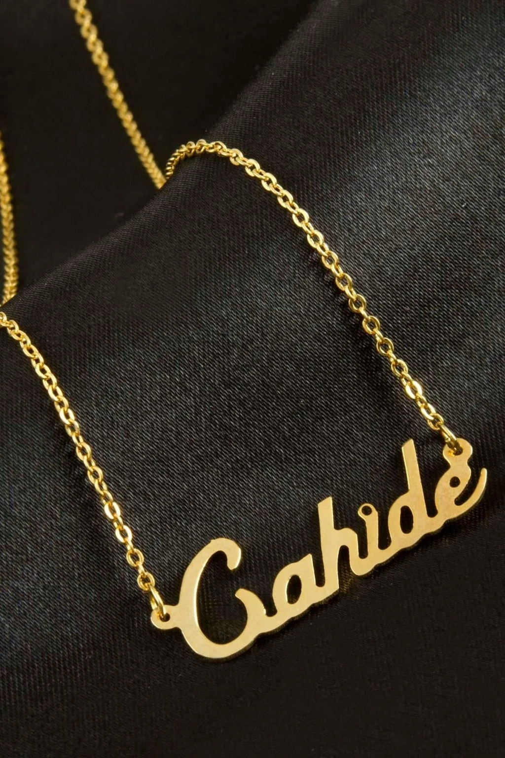 Cahide isimli kolye. İsimli kolye pirinç madeninden ve altın kaplamalıdır. Kişiye özel üretilmektedir.Yazdırmak istediğiniz ismi bize mesaj olarak iletmeniz gerekmektedir. Kullanıma bağlı olarak uzun süre kullanıma uygundur. Ürün malzemesi 1.sınıf kalitededir. Ürün ve zinciri sarı renktedir. Ürün zincir boyu 45 cm ve ürün üzerindeki isimler yaklaşık 3 cmdir. İsim boyları ürün ismine göre degişiklik göstermektedir.