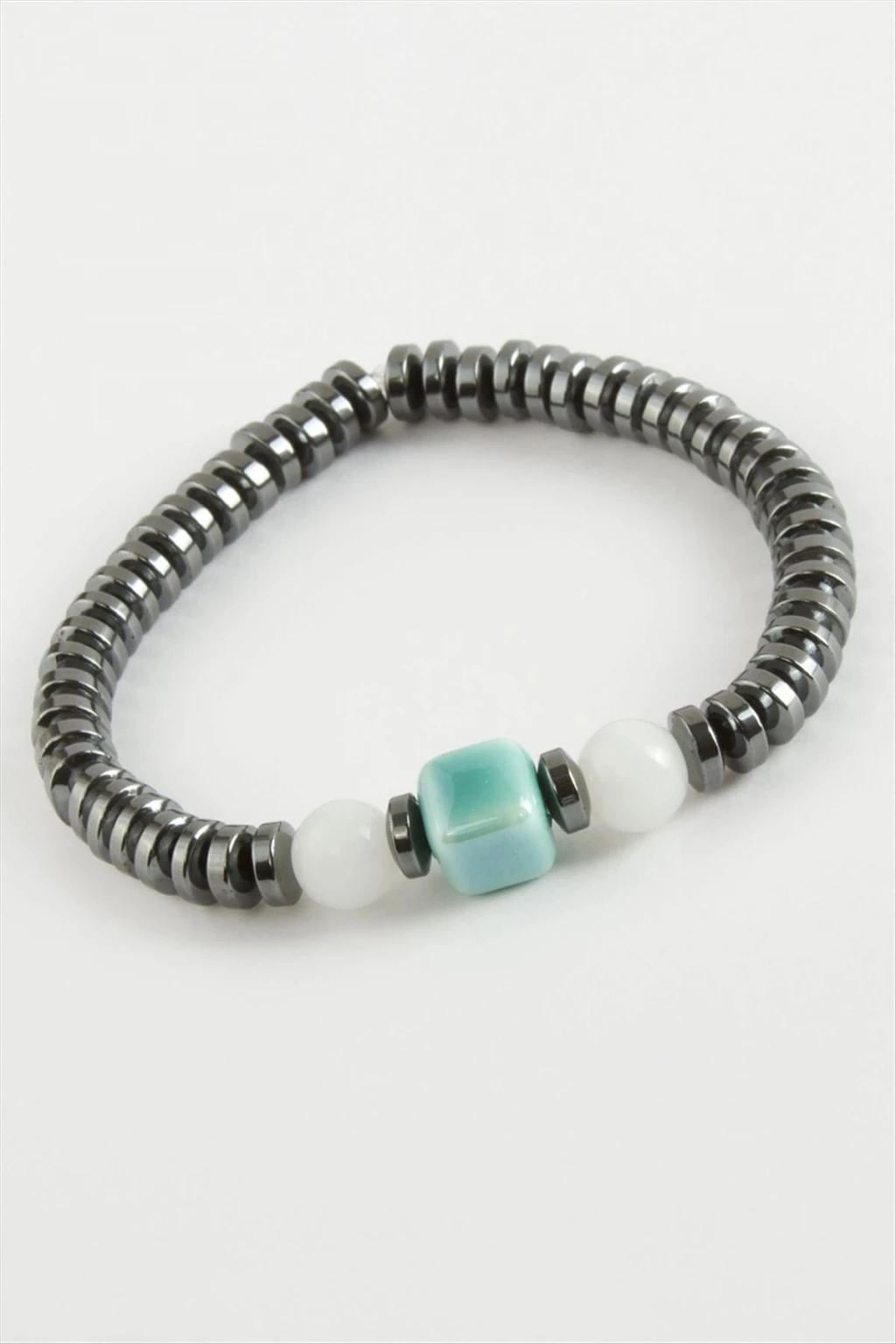 Bileklik: Ürün malzemesi murano  cam ve hematit doğaltaşından imal edilmiştir. Misina üzerine dizilmiş ve esneme özelliği bulunmaktadır.
