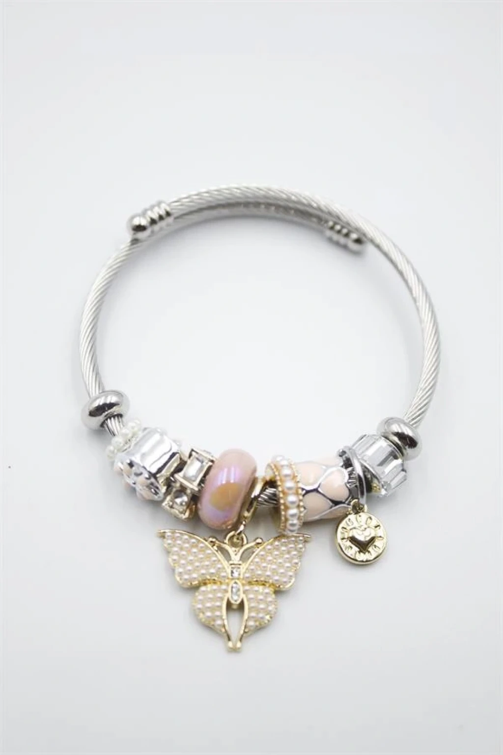 Çelik Charmlı Kelebek Bileklik - Pembe