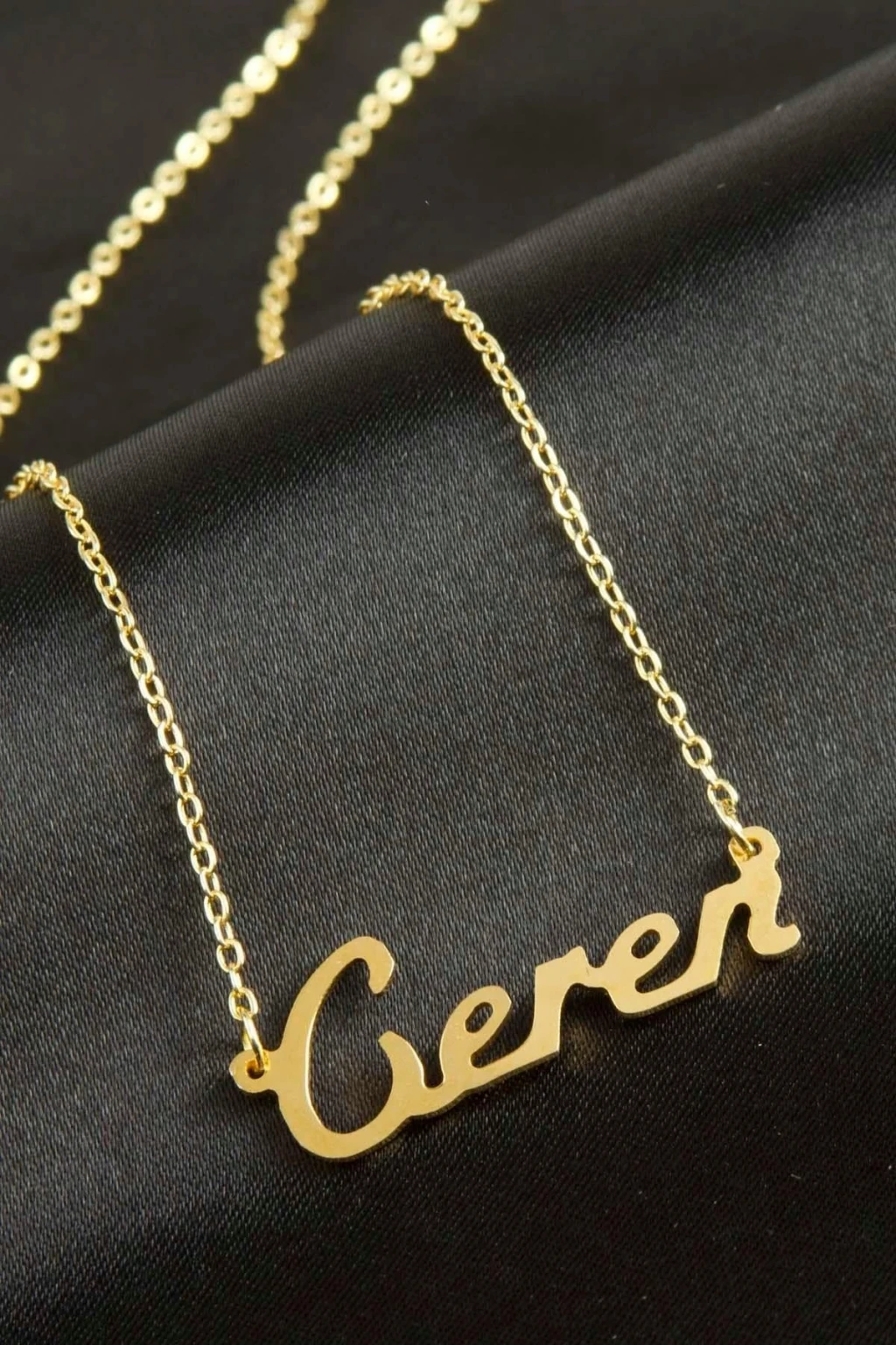 Ceren İsimli Kolye. İsimli kolye pirinç madeninden ve altın kaplamalıdır. Kişiye özel üretilmektedir.Yazdırmak istediğiniz ismi bize mesaj olarak iletmeniz gerekmektedir. Kullanıma bağlı olarak uzun süre kullanıma uygundur. Ürün malzemesi 1.sınıf kalitededir. Ürün ve zinciri sarı renktedir. Ürün zincir boyu 45 cm ve ürün üzerindeki isimler yaklaşık 3 cmdir. İsim boyları ürün ismine göre degişiklik göstermektedir.