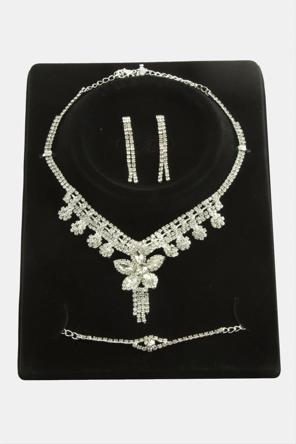 Set Kolye; Ürün malzemesi zirkon taştır. Ürün 1 sınıf kaliteli malzemeden üretilmiştir.Ürün kolye boyu 40 cm, bileklik boyu 18 cm ve küpe uzunluğu 3 cmdir. Ürün içersinde kolye, bileklik ve küpedir. Kartlı ve paketiyle beraber gönderilecektir. Duş, deniz vb yerlerde kullanıma uygun degildir.