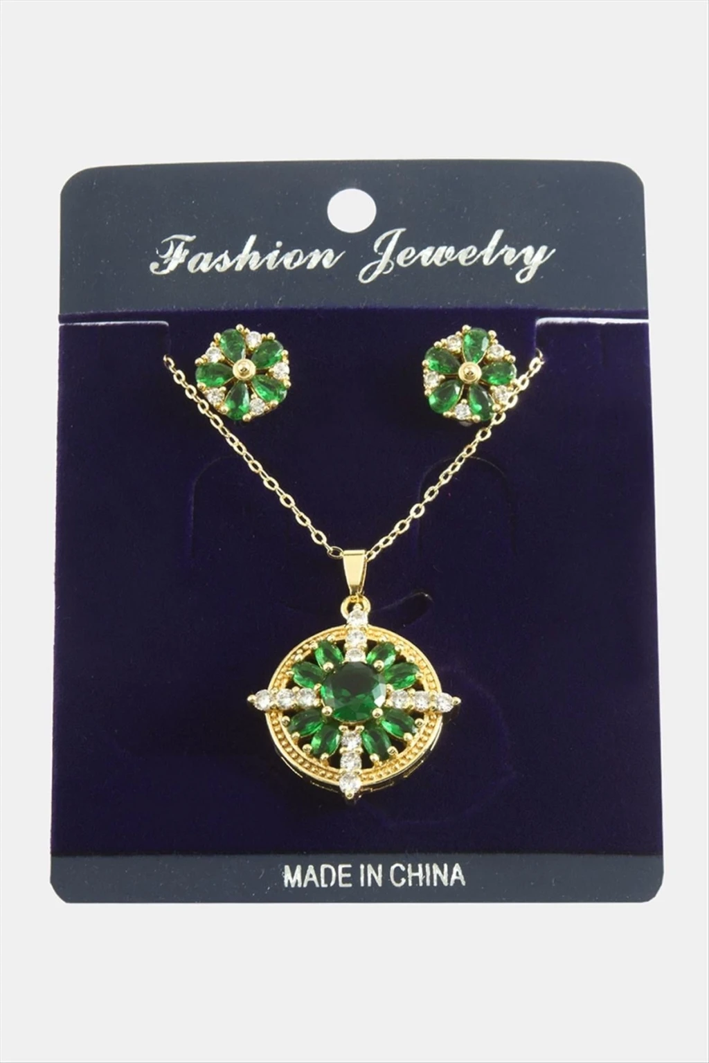 Kolye; Ürün malzemesi metal ve zirkon taştan üretilmiştir. 1 sınıf kaliteli malzeme kullanılmıştır. Ürün 1 adet kolye, ve 1 adet çift küpe vardır. Ürün zincir uzunluğu 45 santimdir. Ürün ucundaki taşlı aparat boyu 2 cmdir.
