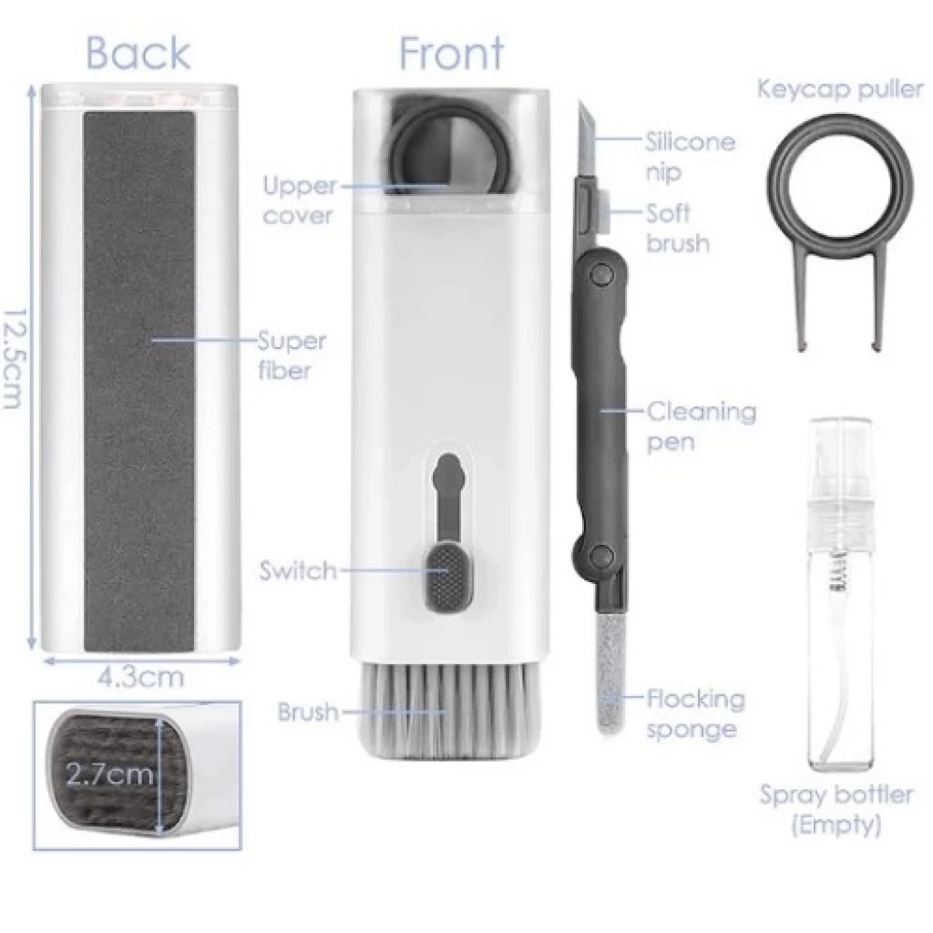 Çok Fonksiyonlu 7 in 1 Airpods KlavyeEkran Kulaklık Temizleme KitiÜrün ÖzellikleriTemizleme Fırçası İle Klavyenizi veklavyenizinin tuşlarını çıkartıp kolaylıkla temizleyebilirsiniz. Çok amaçlı kullanım özelliği ilevazgeçilmez ürünlerden..Flanel mendiller klavyeler, masalar,pencere korkulukları vb. gibi büyük tozlu alanları temizlemek için kullanılır. Buprofesyonel temizleyici kit, bilgisayar ekranları ve klavyeler, tabletekranları, cep telefonu ve TV ekranları, kamera lensleri ve tüm modernkulaklıklar dahil olmak üzere hemen hemen her küçük ev elektronik cihazınıtemizlemekte kullanılabilir.ÇokFonksiyonlu Temizleme Kiti: Klavye Temizleme Kiti, kulaklığın kablosuz şarjkutusunun içindeki tozu temizlemek için idealdir. Yüksek yoğunluklu fırça,kulaklığın ses deliğindeki kiri temizler.BölünmüşÇift Kafalı Tasarım: Kulaklık Temizleme Kitimiz, çeşitli temizlik ihtiyaçlarınıkarşılamak için naylon kıllar, flok sünger, yüksek yoğunluklu fırça, metal uçve tuş başlığı çektirmesi ile tasarlanmıştır.Özellik:Güçlü Silikon uç, kulaklıkların, düğmelerin ve diğer öğelerin yarıklarındakiinatçı lekeleri çıkarır.Ürünboyutu: yaklaşık 143*44*28mm DİKKAT!!!SPREY ŞİŞESİ BOŞ GÖNDERİLMEKTEDİR..Paket İçeriği 1 Adet Çok Fonksiyonlu 7 Parça Airpods Klavye Ekran Kulaklık Temizleme Kiti