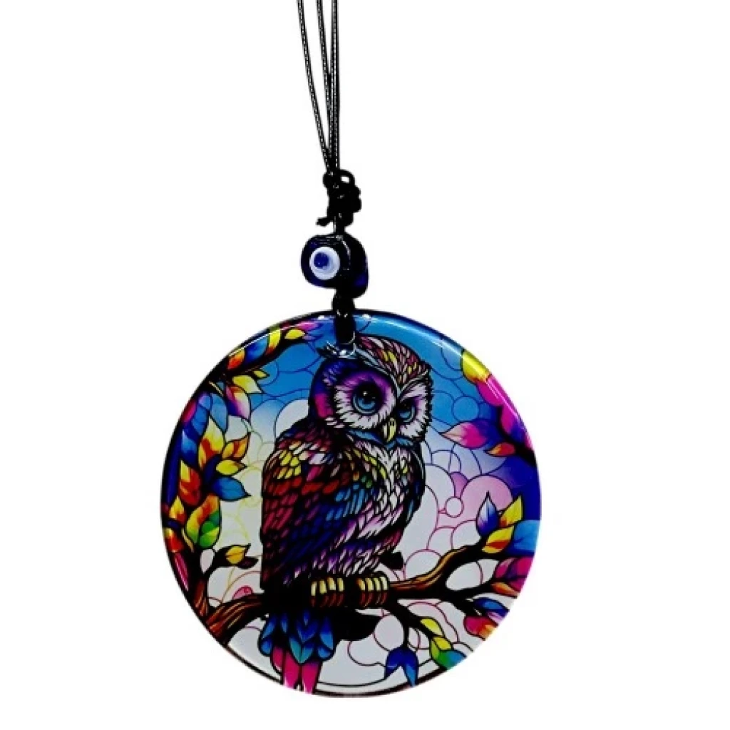 Dalda baykuş resimli duvar süsümüz tamamen el işçiliği ile üretilmiştir. Tasarım harikası el yapımı baykuş resimli duvar süsümüz 12 santimetre çapındadır. Ürünümüz ip dahil 25 santimetre boyundadır.