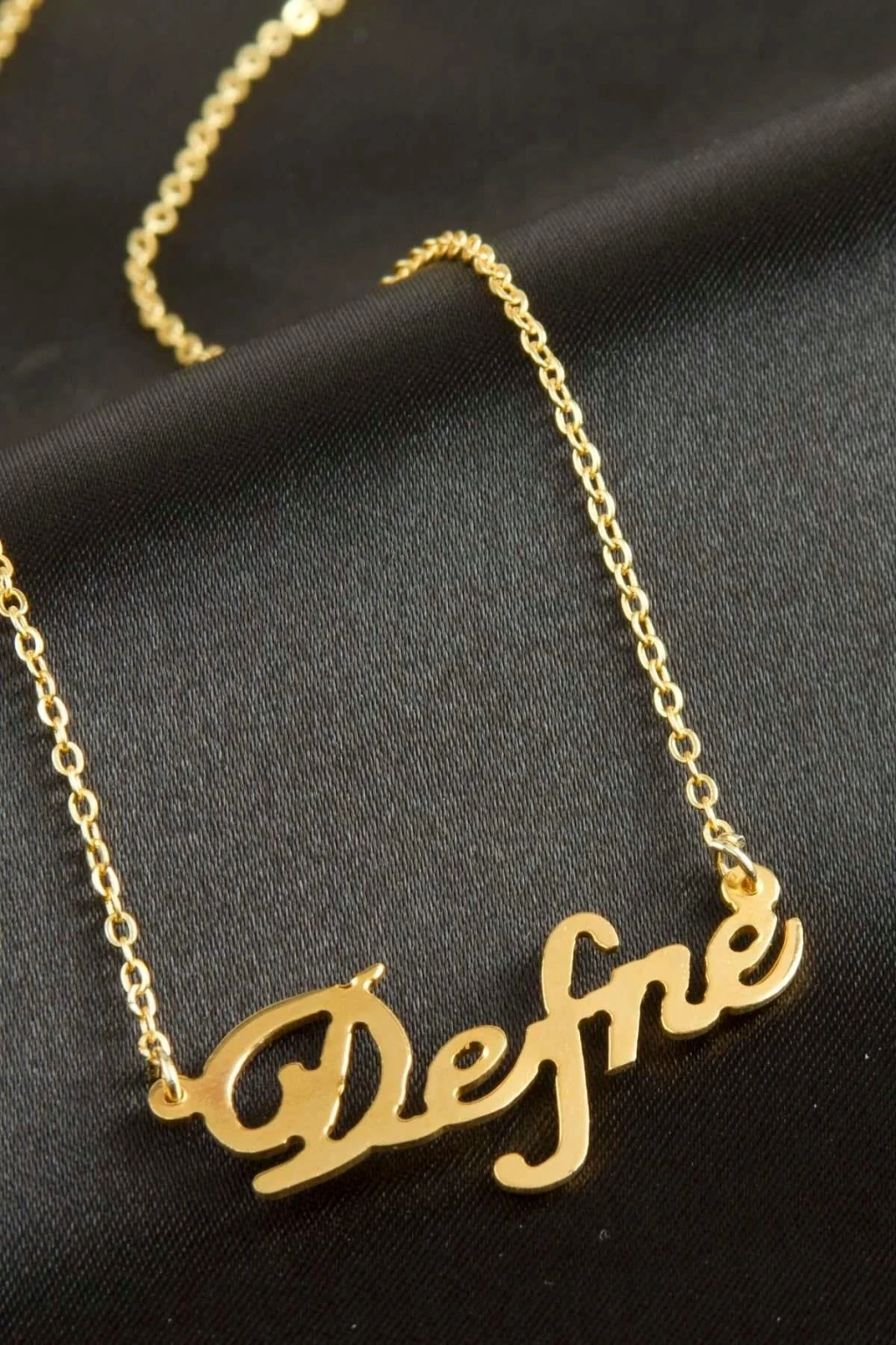 Defne isimli kolye. İsimli kolye pirinç madeninden ve altın kaplamalıdır. Kişiye özel üretilmektedir.Yazdırmak istediğiniz ismi bize mesaj olarak iletmeniz gerekmektedir. Kullanıma bağlı olarak uzun süre kullanıma uygundur. Ürün malzemesi 1.sınıf kalitededir. Ürün ve zinciri sarı renktedir. Ürün zincir boyu 45 cm ve ürün üzerindeki isimler yaklaşık 3 cmdir. İsim boyları ürün ismine göre degişiklik göstermektedir.