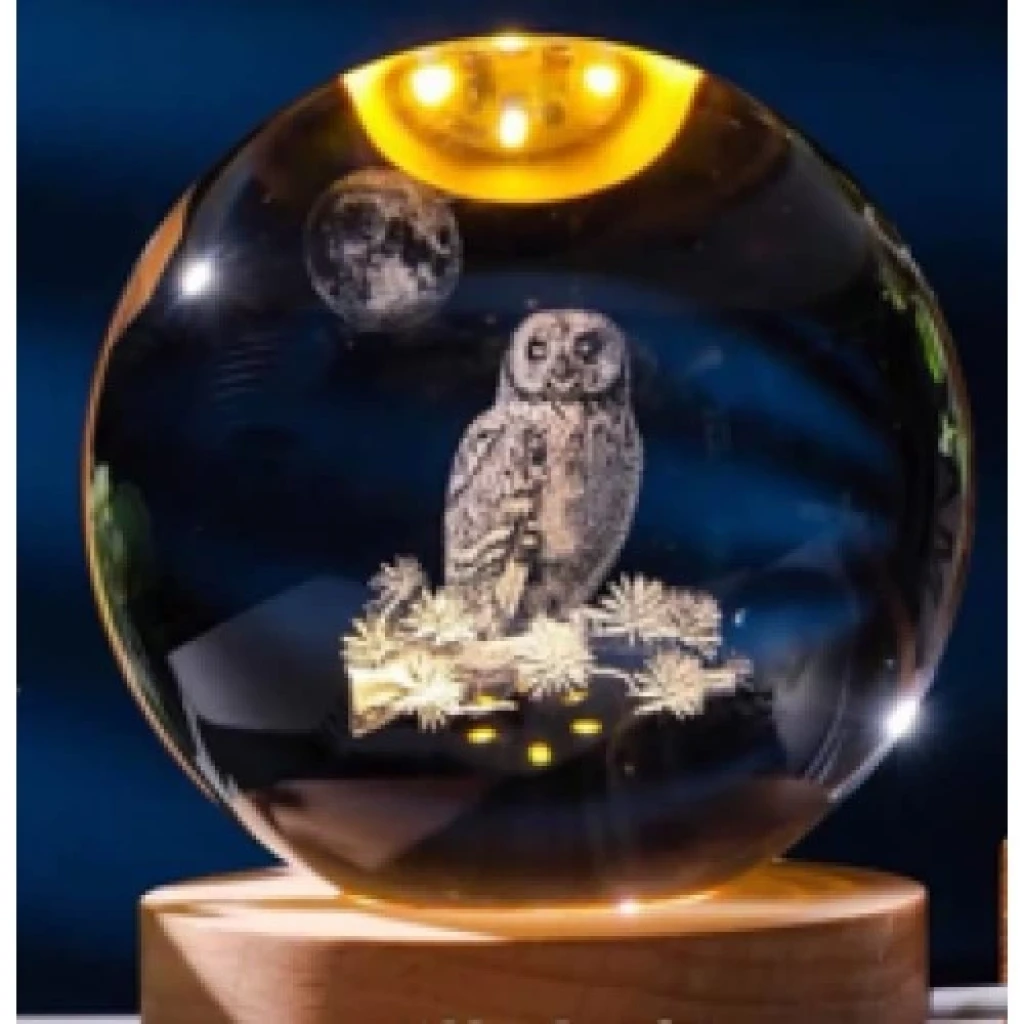 Büyük boy 8cm baykuş tasarımlı ışıklı cam küre ile odanıza gizemli bir hava katın. Ahşap altlığı ve LED ışığı ile benzersiz bir gece lambası.