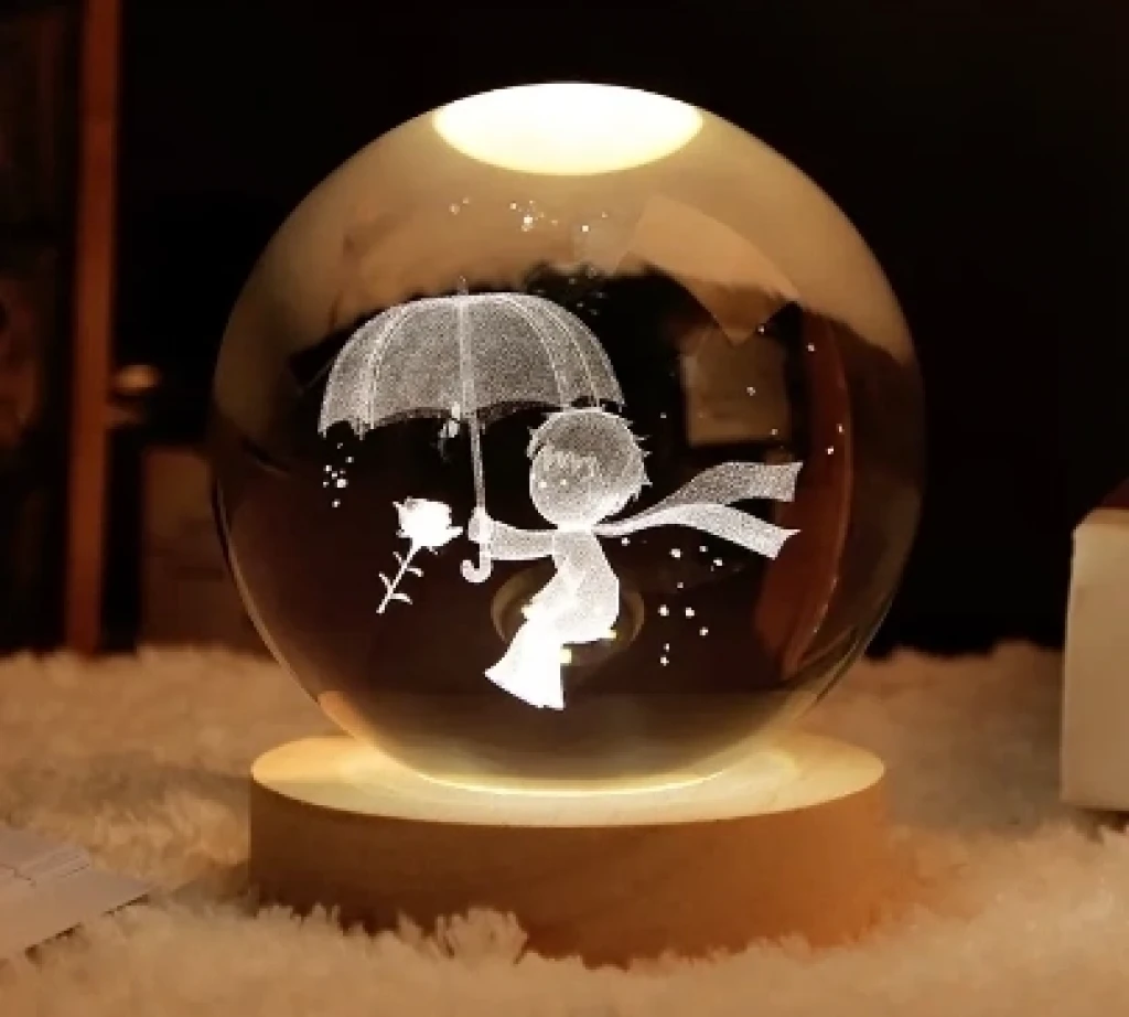 Dekoratif Küçük Prens Tasarımlı Ahşap Altlıklı Işıklı Cam Küre Büyük Boy Cam:8cm Ahşap:2cm