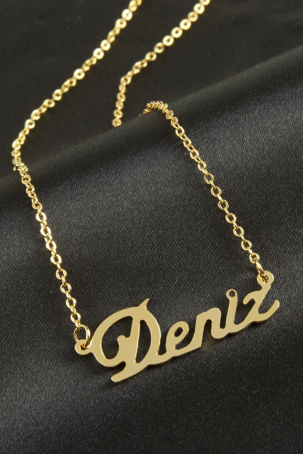 Deniz isimli kolye. İsimli kolye pirinç madeninden ve altın kaplamalıdır. Kişiye özel üretilmektedir.Yazdırmak istediğiniz ismi bize mesaj olarak iletmeniz gerekmektedir. Kullanıma bağlı olarak uzun süre kullanıma uygundur. Ürün malzemesi 1.sınıf kalitededir. Ürün ve zinciri sarı renktedir. Ürün zincir boyu 45 cm ve ürün üzerindeki isimler yaklaşık 3 cmdir. İsim boyları ürün ismine göre degişiklik göstermektedir.