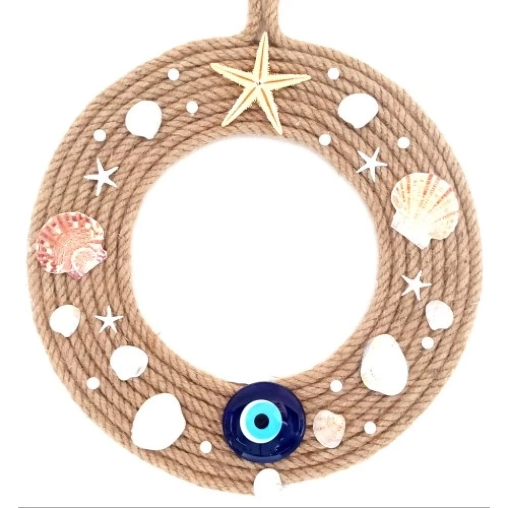Deniz yıldızlı, nazar boncuklu, incili süsümüz 30 x 30 santimetre ölçülerindedir. El yapımı ürünümüzü ister kendiniz için, isterseniz sevdiklerinize hediye etmek için tercih edebilirsiniz.