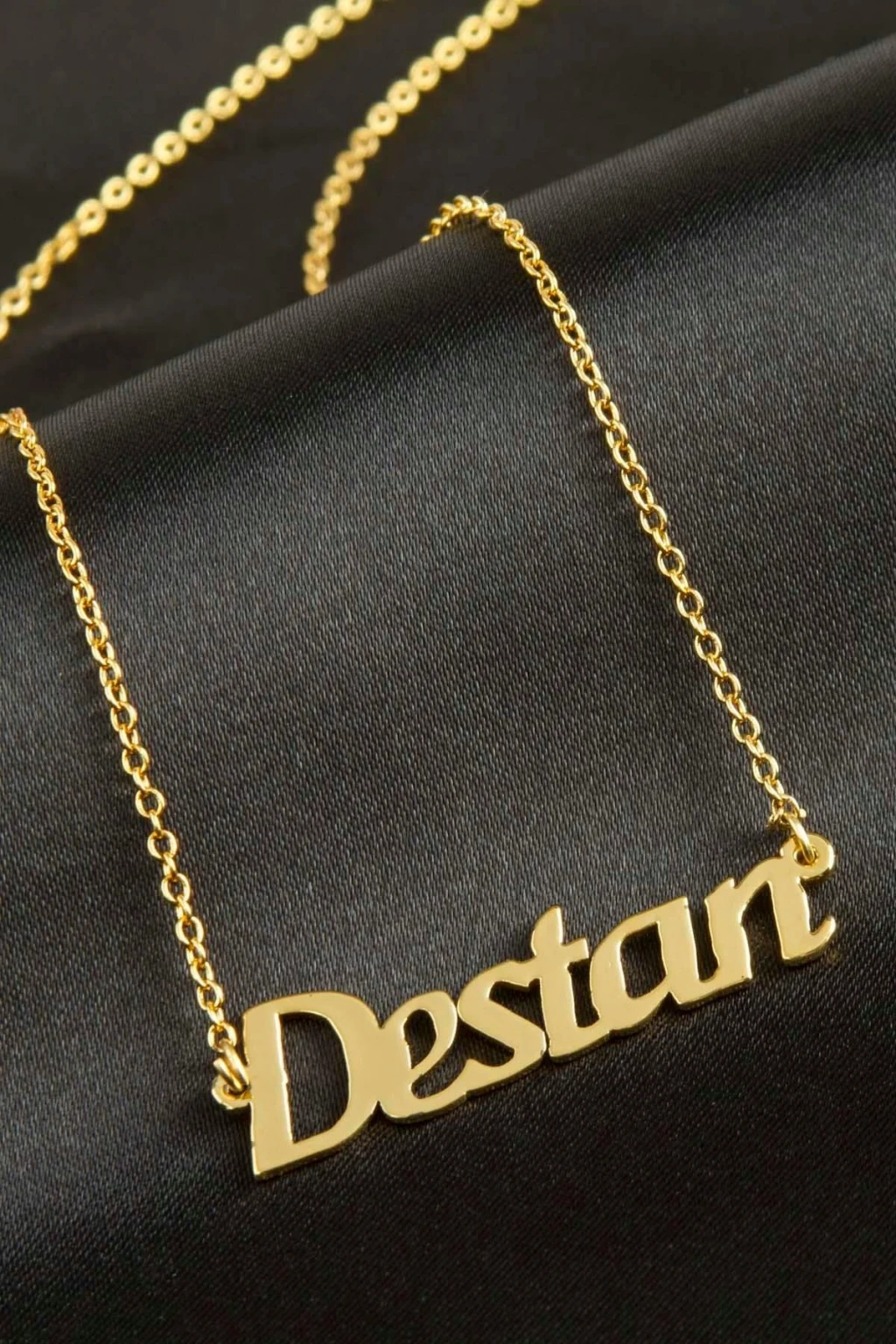 Destan isimli kolye. İsimli kolye pirinç madeninden ve altın kaplamalıdır. Kişiye özel üretilmektedir.Yazdırmak istediğiniz ismi bize mesaj olarak iletmeniz gerekmektedir. Kullanıma bağlı olarak uzun süre kullanıma uygundur. Ürün malzemesi 1.sınıf kalitededir. Ürün ve zinciri sarı renktedir. Ürün zincir boyu 45 cm ve ürün üzerindeki isimler yaklaşık 3 cmdir. İsim boyları ürün ismine göre degişiklik göstermektedir.