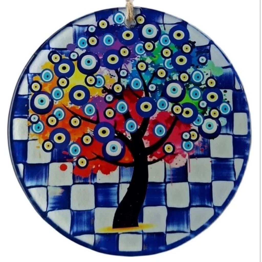 Dilek ağacı desenli ürünümüz nazar boncukları ile süslenmiştir.Ürünümüz 15 santimetre çapındadır. Ürünümüz ip dahil yaklaşık 30 santimetre boyundadır. Ürünümüz füzyon cam malzeme kullanılarak üretilmektedir.