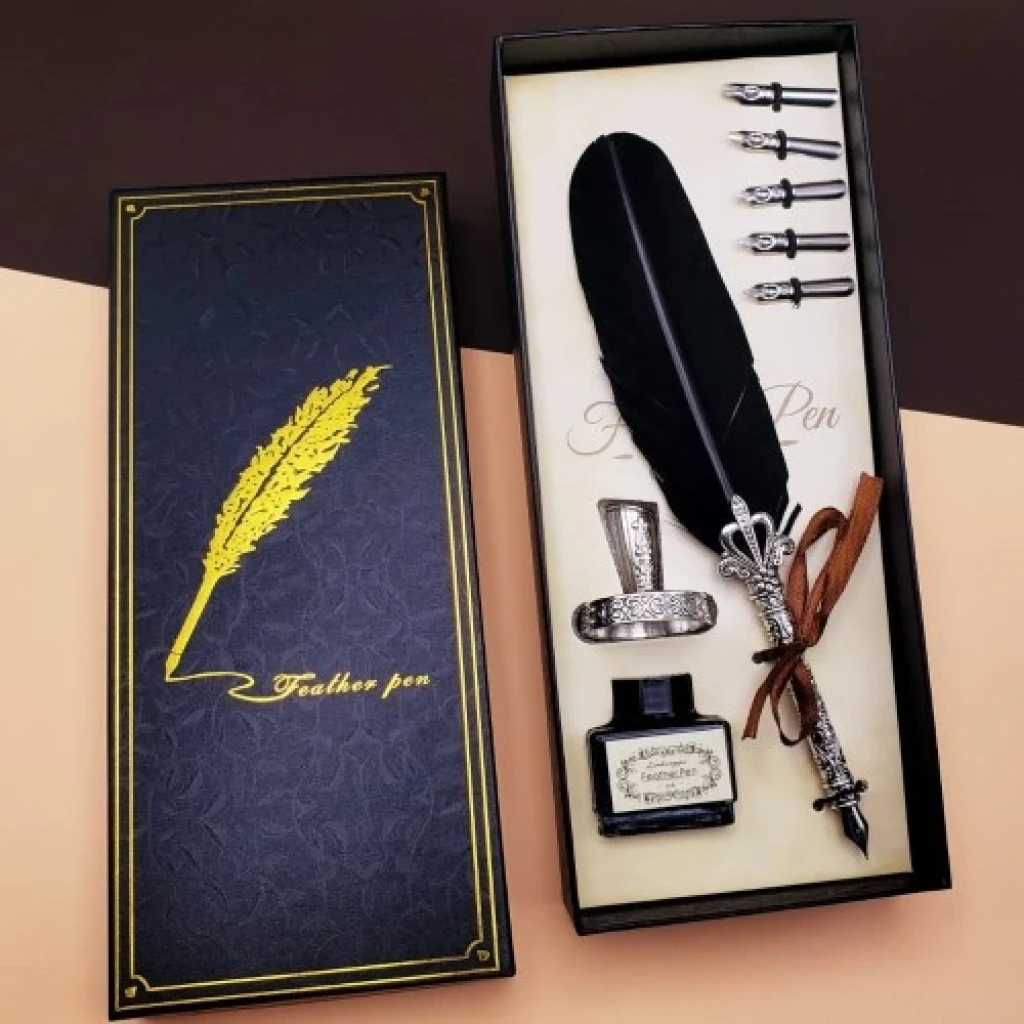 Toptan Divit Hokka Kalem SetiÖzel tasarımlı divit kalem seti sevdiklerinize çok şık tasarımlı hediye.Divit kalem seti özel tasarım olarak tasarlanmış olup özel günlerde en iyi hediye seçeneğidir.Divit kalem setini masaüstü dekor olarak kullanabilirsiniz.Öğretmenler günü, babalar günü, anneler günü, ve sevgililer günü hediyesi olarak verebilirsiniz.Divit kalem set şık bir tasarıma sahip olup dikkatleri üstüne çekecektir.Ürün Özellikleri:* Divit kalem ucu metal tasarımlı uç kısmı tüylüdür.* Yanında 5 farklı yazı başlığı vardır.* Set içerisinde divit kalem mürekkebi yer almaktadır.* Set içerisinde divit kalem için masaüstü aparatı yer almaktadır.* Divit kalem seti özel tasarımlı hediyelik kutusunda gönderilmektedir.Paket İçeriği:* 1 adet tüylü kalem * 1 adet kalemlik* 1 adet mürekkep* 5 adet divit uç
