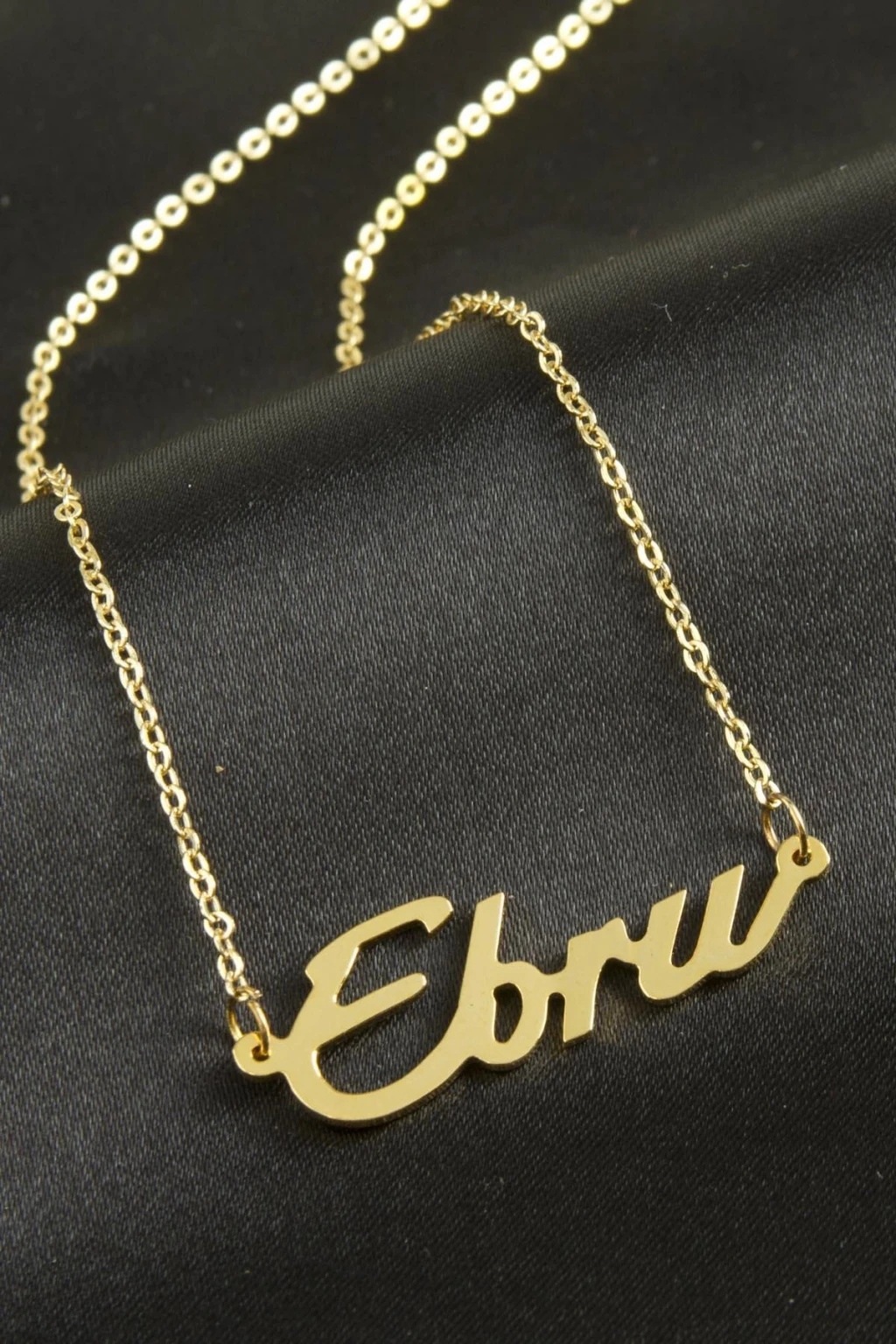 Ebru isimli kolye. İsimli kolye pirinç madeninden ve altın kaplamalıdır. Kişiye özel üretilmektedir.Yazdırmak istediğiniz ismi bize mesaj olarak iletmeniz gerekmektedir. Kullanıma bağlı olarak uzun süre kullanıma uygundur. Ürün malzemesi 1.sınıf kalitededir. Ürün ve zinciri sarı renktedir. Ürün zincir boyu 45 cm ve ürün üzerindeki isimler yaklaşık 3 cmdir. İsim boyları ürün ismine göre degişiklik göstermektedir.