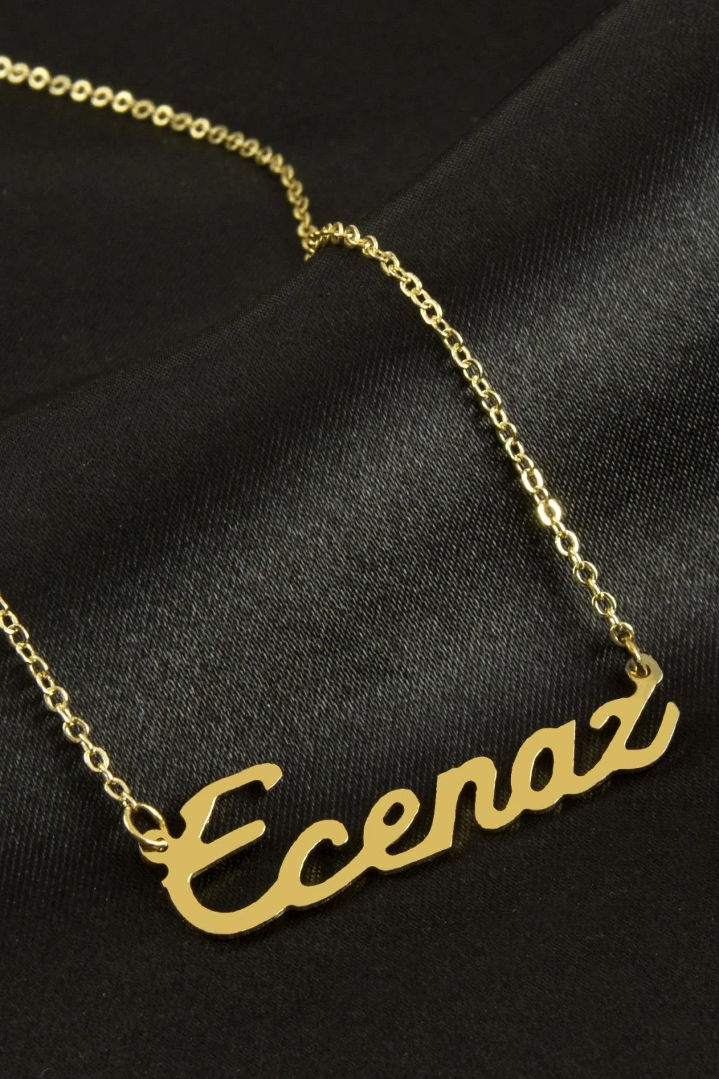 Ecenaz İsimli Kolye. İsimli kolye pirinç madeninden ve altın kaplamalıdır. Kişiye özel üretilmektedir.Yazdırmak istediğiniz ismi bize mesaj olarak iletmeniz gerekmektedir. Kullanıma bağlı olarak uzun süre kullanıma uygundur. Ürün malzemesi 1.sınıf kalitededir. Ürün ve zinciri sarı renktedir. Ürün zincir boyu 45 cm ve ürün üzerindeki isimler yaklaşık 3 cmdir. İsim boyları ürün ismine göre degişiklik göstermektedir.