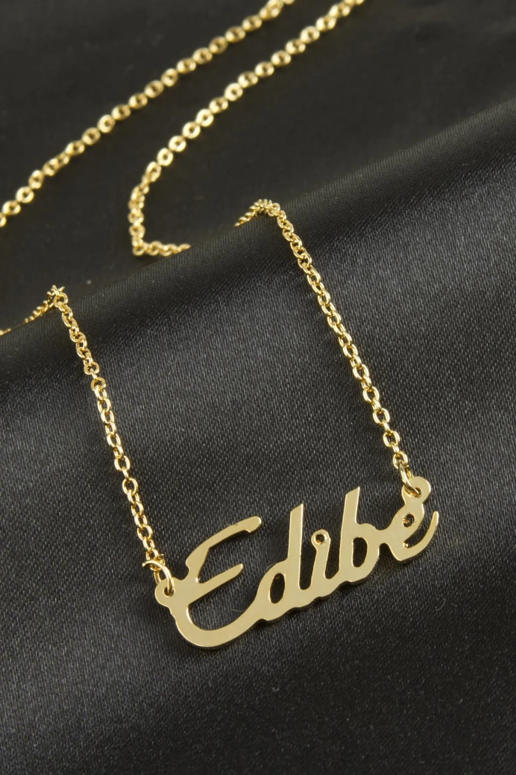 Edibe isimli kolye. İsimli kolye pirinç madeninden ve altın kaplamalıdır. Kişiye özel üretilmektedir.Yazdırmak istediğiniz ismi bize mesaj olarak iletmeniz gerekmektedir. Kullanıma bağlı olarak uzun süre kullanıma uygundur. Ürün malzemesi 1.sınıf kalitededir. Ürün ve zinciri sarı renktedir. Ürün zincir boyu 45 cm ve ürün üzerindeki isimler yaklaşık 3 cmdir. İsim boyları ürün ismine göre degişiklik göstermektedir.