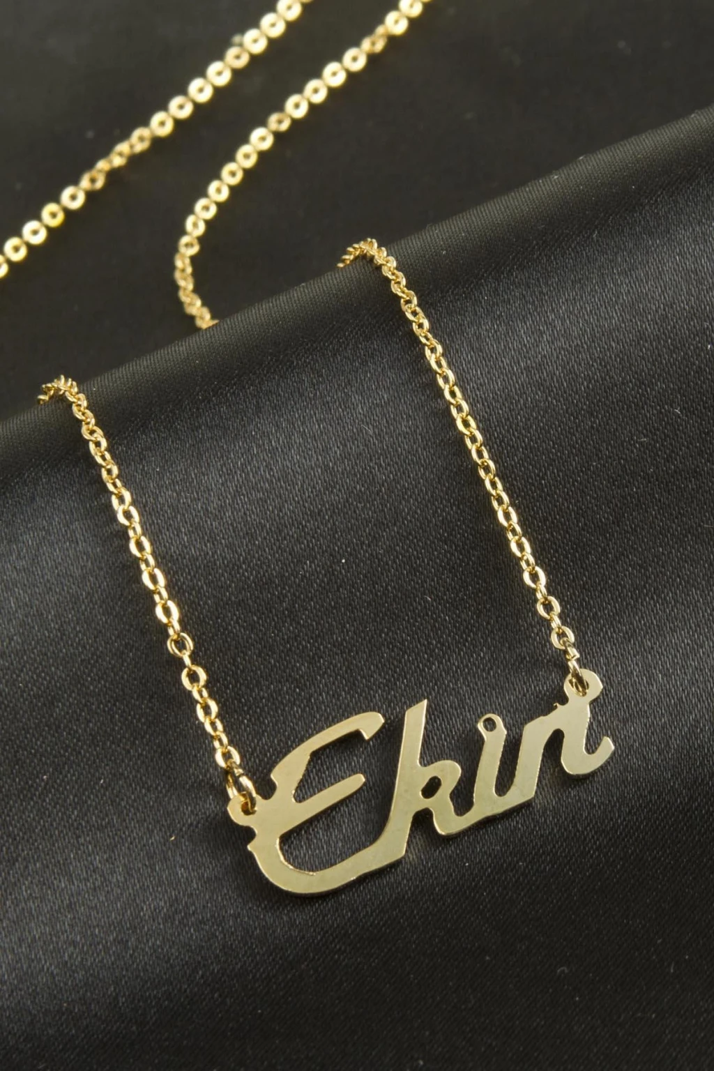 Ekin isimli kolye. İsimli kolye pirinç madeninden ve altın kaplamalıdır. Kişiye özel üretilmektedir.Yazdırmak istediğiniz ismi bize mesaj olarak iletmeniz gerekmektedir. Kullanıma bağlı olarak uzun süre kullanıma uygundur. Ürün malzemesi 1.sınıf kalitededir. Ürün ve zinciri sarı renktedir. Ürün zincir boyu 45 cm ve ürün üzerindeki isimler yaklaşık 3 cmdir. İsim boyları ürün ismine göre degişiklik göstermektedir.